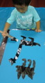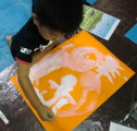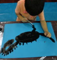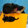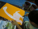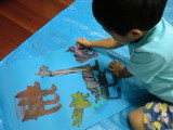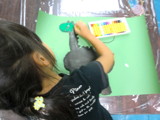 先ずは下塗りから・・・。ちいさならぴすっこさんにとって、四つ切り画用紙はとってもとっても大きなものです。だからおおきならぴすっこさんみたいに座ったまま机に向って描くのは結構たいへん。「こっちで描くぅ〜」ただ今水曜クラス最年少おうたくん、途中から自分で場所を床にかえて、夢中で描きはじめました。立ってみたり、座ってみたり、反対側にまわってみたり、床の上なら自由だもんね♪