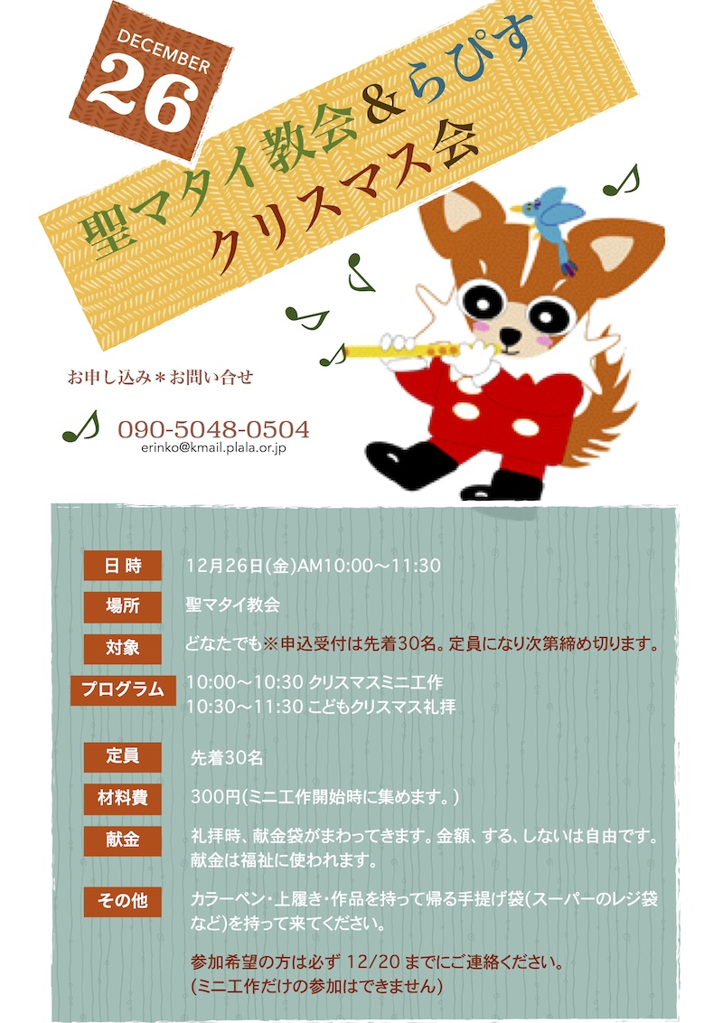 恒例のクリスマス会です。超ミニ工作、歌やゲーム(あくまでもアナログです)で楽しく過ごしましょう。らぴっすこも元らぴすっこも、らぴすってなんなんだ?ってひとも大歓迎です。もちろん勧誘などしませんのでお気軽にどうぞ。 3才以下は保護者同伴でお願いします。受付は先着順、定員になり次第締め切りますので、お早めにどうぞ♪