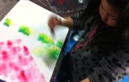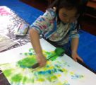 まずは、ローラーで下地作り。自由な色で、自由に転がして・・・。でもローラーだけ渡して「さあどうぞ」ってわけではなく、おはなしします。ローラーの面白さが発見出来るように、おはなしします。ローラーを好きになるきっかけができるように、おはなしします。きちんと聞く力のあるひとは、集中力が違います。集中するから発見があります。発見すると、それに工夫してみたくなります。うまくいかなくても、工夫する習慣ができているので簡単には挫けません。