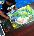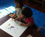 雲ひとつない青空の下、みんな絵の具だらけになって、大きな大きなパネルに元気いっぱい自由に描きました。