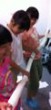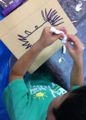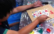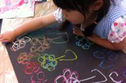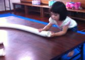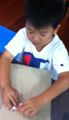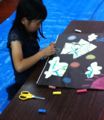 後半は切り紙。中に瓶を入れて花瓶、ライトを入れてランプシェード・・・「そやっ!貯金箱にしよっ!」「お金落ちるで」「・・・」