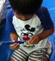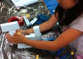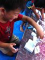 畳屋さんに頂いたスタイロフォーム片をくっつけながらお魚さんたちの住む場所を作ります。手で簡単にパキパキ折れちゃいます。「うわっ!すごい音する!」最初はその折るときの音の大きさに、みんな盛り上がっていました。普通の発泡スチロールよりも静電気付きのゴミが出なくて後片付けが簡単かも。