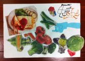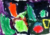 コラージュをもとに、描きました。そうすけくん(5才)の作品です。クレパスで力一杯描きました♪♪♪