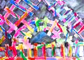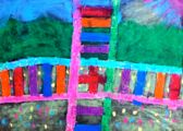 線路だからって、絵の中では電車は必須アイテムではありません。線路が色とりどりに楽しく変身しました。