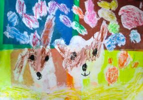 春のせいでしょうか、なんだかみんなほっこりした絵になりました。 左からあんじちゃん(小2)、あんじゅちゃん(小1)、そうすけくん(6才)の作品です。