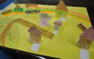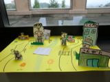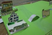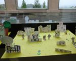 「こ〜やって見たらおもしろ〜い」らぴすっこさんが屈んで、画用紙でできた町に目の高さを合わせました。上から見下ろすのとは全然違って奥行きがあって、なんだかその町の人々の生活のなかに入っていくようです。