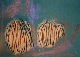 左が夢みたいにきれいなタマネギのわこちゃん(5才)、右が前回お休みだったのですが、今日はコンテでガ〜〜ッと戸惑いのないタマネギを描いたあさひくん(6才)の作品です。