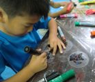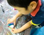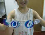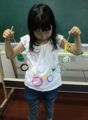HyperScrapCreatorさんに先日お譲りいただいたまあるい透明のシート、薄いので簡単に穴も開けられまして、絵などを描いて・・・紐を通して・・・ガーランドの出来上がり。光に翳したり、重ねてみたり、みんな楽しみながら作りました。