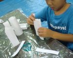 画用紙とハサミとボンド・・・で、円柱・三角柱・四角柱・・・星角柱・カクカク柱(なんだそりゃ)・・・「これでできるだけ高くて、安定感のあるものつくって」・・・高くなるごとに、みんなの声も高くなっていきました。
