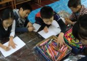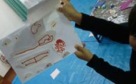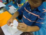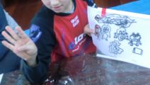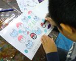 左から「うん、久々にいいのができた♪」と会心の作・・・ゆうすけくん(小5)、こぢんまりしていますが、相当時間かけて丁寧に丁寧に・・・わこちゃん(5才)、喧噪の中黙々と・・・こうがくん(4才)、お花の色使いがとってもきれいなさきちゃん(小4)の作品です。