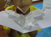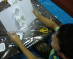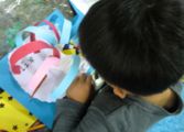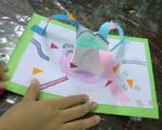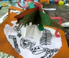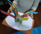 ポップアップカードの仕掛けっていろいろあって・・・いくつか説明するのにずいぶん時間がかかってしまいました。みんなでやりながら説明するわけですが、あわてんぼうさんは、最後まで聞かずにいきなり立った状態で(ポップアップ部分ね)接着しようとするもんで、うまくいかない。接着剤もぶちゅぶちゅつけちゃうとすぐにつかないし、余計なところまでくっついてイライラしちゃう、ごちょごちょやっているうちに紙はヨレヨレになってくる・・・気持ちはわかる、わかるんだが・・・工作で大事なのはやっぱり落ち着きなんだ。話は最後まで聞こう。