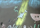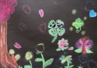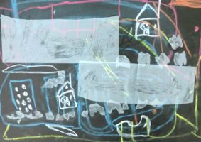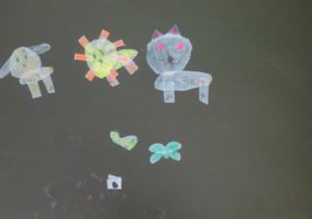 左から「うん、久々にいいのができた♪」と会心の作・・・ゆうすけくん(小5)、こぢんまりしていますが、相当時間かけて丁寧に丁寧に・・・わこちゃん(5才)、喧噪の中黙々と・・・こうがくん(4才)、お花の色使いがとってもきれいなさきちゃん(小4)の作品です。
