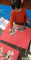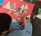三角形のものって結構あります。「おにぎり!」「やまっ!」「やねっ!」・・・といろいろでまして、それから東京タワーや橋、クレーン、建築中の家なんかの写真の中から三角形をみつけてもらいました。「あった!」「こっちも!」「あ、ここ!」とつかみは上々・・・で、三角形でアート。