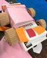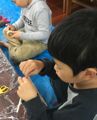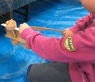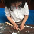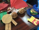 「むずかし〜〜」「うん、むずかしいことしてみよう。かんたんなことばっかりやってちゃ人類に発展はないよ。」片段ボールをまっすぐに切るのも、軸にきっちりクルクル巻くのも、なんにしても、ちょっとしたコツがあります。コツって聞いただけじゃ掴みにくい。力の入れどころとか、手首のかえしとか、「こうかな〜、こうかな〜」ってやっているときに、突然天から降ってきたりする。だから、難しくてもやれるだけやってみなきゃ、なんにもできないままだ・・・と、結構時間掛かりまして、仕掛け部分はまた来週・・・おっと、「ゴム動力の車」つくってます♪