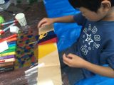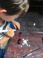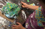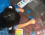 先日の糸巻き巻き模様の画用紙に紫陽花が咲きました。あさひくん(7才)の作品。