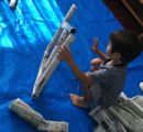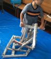 新聞を棒状に巻いて、とにかく立つものを作ってみよう。「持って帰りたい〜」「いやいや、クルマに入らんでしょう。」