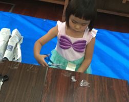 今回、接着に梱包用透明テープを使用しました(教室に大量に在庫していたもので)。テープカッターなどついていないもんで、みんなが組み立てに頑張っている間、私はひたすらこのテープをハサミ(なんでも切るよ〜)で適当な長さに切って、みんなが使いやすいように、テーブルの端にくっつけてました。さて、画像はばっきーちゃん(3才)、「ばっきーもやるぅ〜」と、私を真似て始めたのですが・・・まっ、なかなかうまくはいきません。でもね、彼女、先輩女子えみるちゃん(7才)のアドバイスも受けて、1時間後には達人になっていました。3才の集中力、侮れません。継続は力なり。