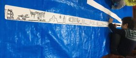 背景が流れて行くタイプの絵本?です。主人公を決めて、さあ、旅のはじまりはじまり〜。おぉ〜〜〜〜っ、みんなどんどん旅が長くなっていく〜。