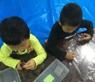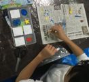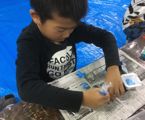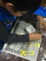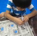で、その木工用接着剤、今回は各自でコルネ(絞り袋)を作って、ニョロニョロッとやってます。柔なコルネなもんで、力入れすぎると、まっ、すぐに破れてドバッとなっちゃうんですが、みんな絶妙な力加減で頑張ってくれました。ほら、みんな真剣勝負。