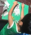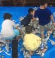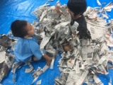 クラスによってカラーみたいのがありまして……。こちらはいつもやたらと元気な金曜クラス。その元気、新聞で吸い取ってあげましょう……と企んだのですが、彼らの元気、そんなもんじゃないらしい。よしっ、来週は絵の具でどぉ〜〜んといくぞ〜!!