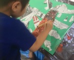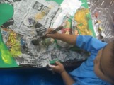 ちぎった新聞をあれやらこれやら好きなように貼って、好きなように絵の具……ん?意外と慎重に……素晴らしい集中力……