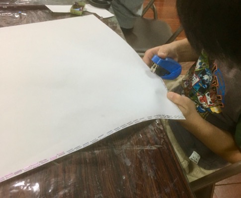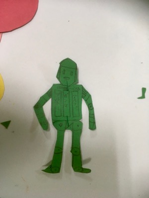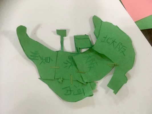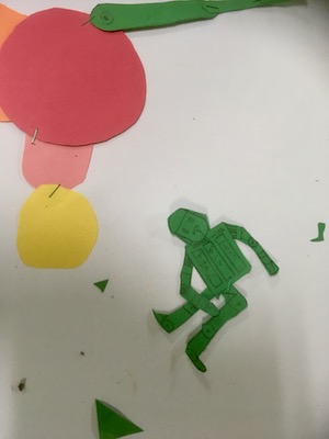 切ったカタチをステープラーで繋いで、部分的に動かせる絵。ヘビさんがクネクネしたり、カブトムシがコソコソしたり……。月曜クラスさん、カブトムシ作りながらゴキブリの話題になり……「ゴキブリだってきれいなところで飼って、きれいなもの食べたら汚くないんやで〜」「えぇ〜〜〜」「なぁなぁせんせぇ、このクイズ解ける?」などと、コロコロ話も変わりつつ、まったりと?過ごしております。