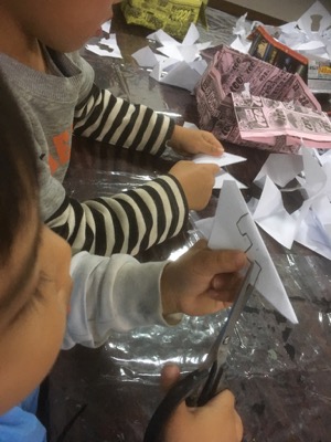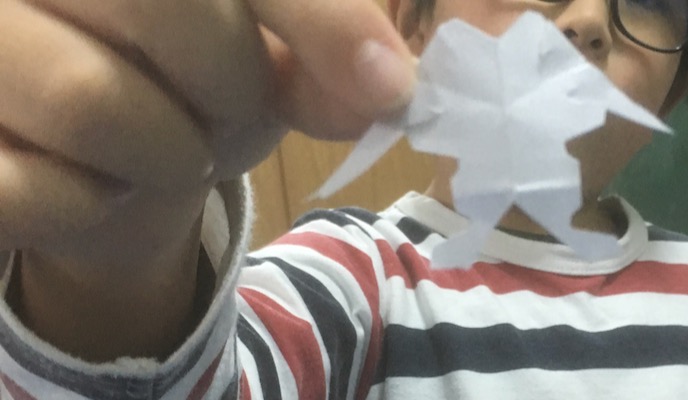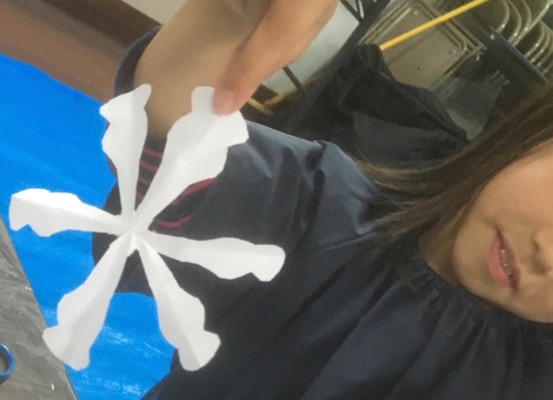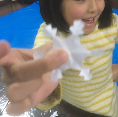 クリスマスが近いせいか……ついこの間までの嵐の金曜クラスが……angelに見えて来た今日この頃……。小さいらぴすっこさんでも落ち着いてお話を聞いて、落ち着いてよぉ〜く見ていれば、ま、それなりにできる、ざっくりした切り紙ですが、最高齢が8才という若さ弾ける金曜クラス、大丈夫かな〜???と思ってたら……おっ!?なかなかやるじゃん♪星名人や雪名人が続々誕生。