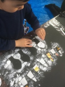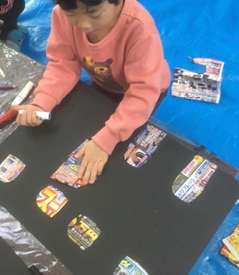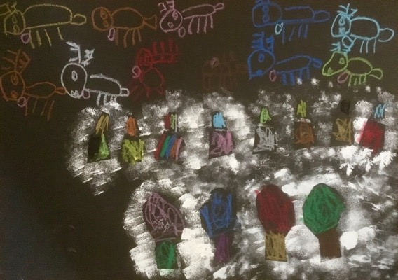 さて、こちらはりんたろうくん(4才)の作品。かわいいお家が並びました。トナカイさんたちもわちゃわちゃ登場。