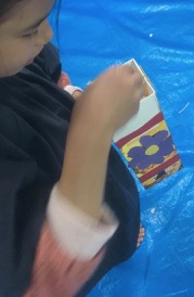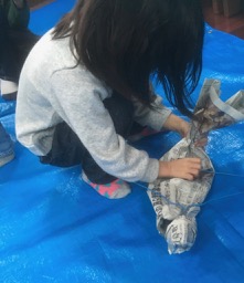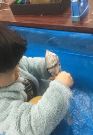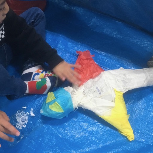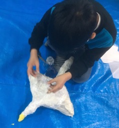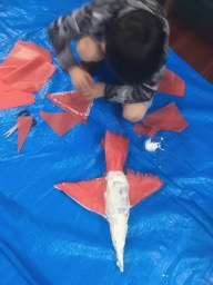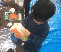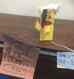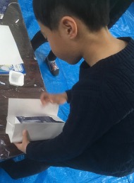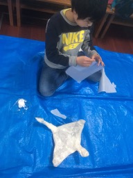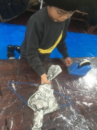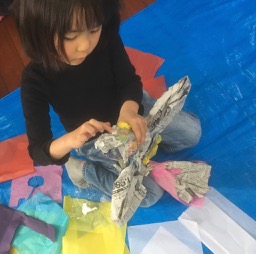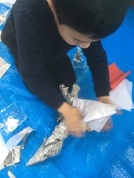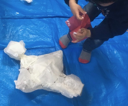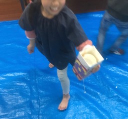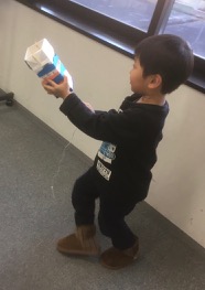 んなわけで「豆まきマシーン」を作成。土曜クラスさん、みんなお願いしていた牛乳パックを携え、「これでなにつくんの〜???」と朝から元気いっぱい。豆がわりの小さな円形ダンボールを撒いて撒いて撒きまくりました。豆に混じって飛行機やらロケットやら、お金も飛んでいた……。