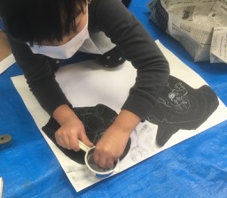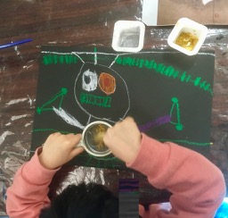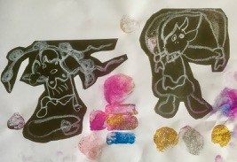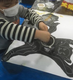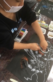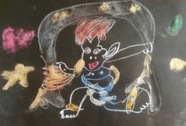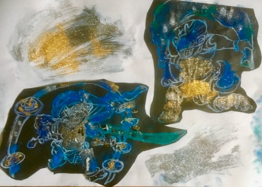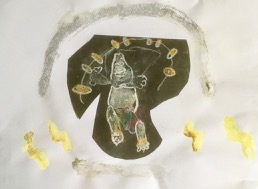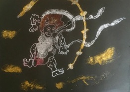 無茶振りです。「風神雷神」……ちいさいちいさいこどもが、こんなもの描くなんて。でも、「ほ〜〜!そう見たか。」って面白い。なんか結構躍動的な絵になりました。風神雷神大暴れ♪♪