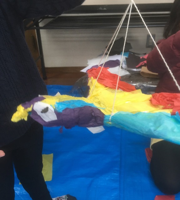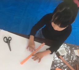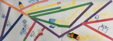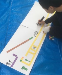 春っぽくなってきましたね〜。花粉症でお悩みの方も多いようです。私も以前は薬が手放せないほどひどかったのですが、ある時肺炎を患いまして点滴生活、それっきり体質が変わっちゃったのか、たいした症状はでなくなりました。で、毎日ちょろちょろしているわけですが、どっちかというとin doorでごちょごちょしているのが好き。で、今回も当初は壮大なるちまちました工作(なんだそりゃ)を考えていたのですが、土曜クラスの朝になって、「なにがおもろいねん」と大阪弁が頭をよぎり、ここはやっぱり素直にいこうじゃないか、考えるのは作者であるらぴすっこさんたちだ、という結論に達し、急遽短冊状の色画用紙を用意しました。なんかね、盛り上がりました。「もっと大きくする〜」「家に持って帰って続きやりたい〜」ってな声があちこちから出たものですから、持って帰っていただきました。