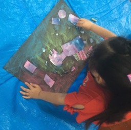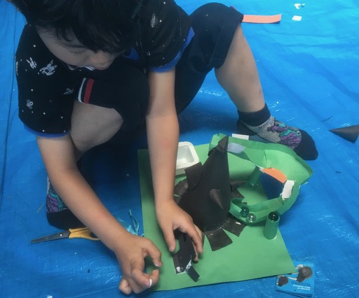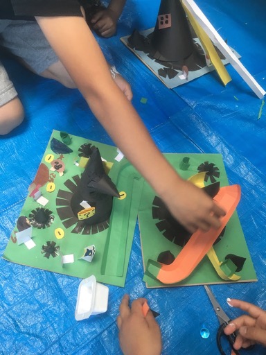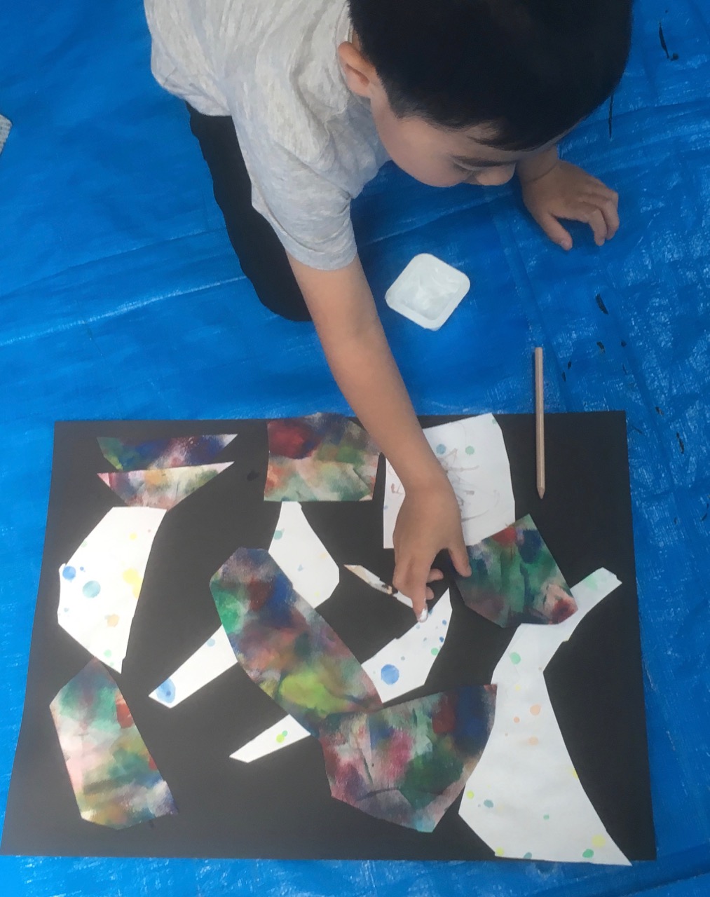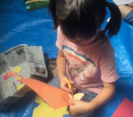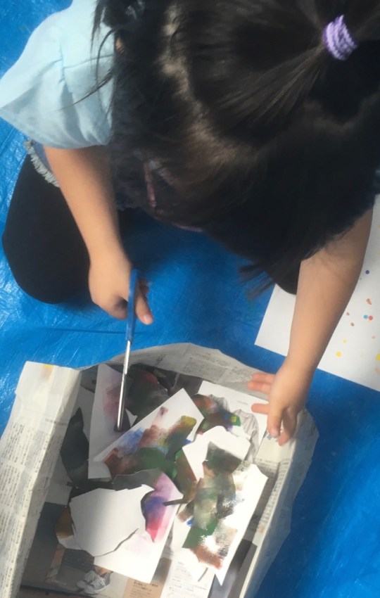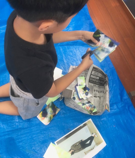 10連休明け……頭を通常モードに戻すのには、ちょっと時間を要しました。小学生のみんなは宿題がどっさりあったんだってね。初日に全部片付けたってひとも多いみたいです。わたしは連休中にためた宿題を片付けるのに一週間かかってしまいました。はぁ〜。それはさておき……。コラージュです。先月絵の具で遊んだ画用紙をバラバラにカット。画用紙の上に並べながら、考えて……さあ、どんな世界ができるかな?