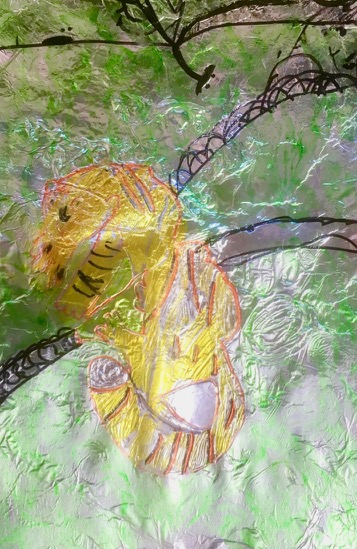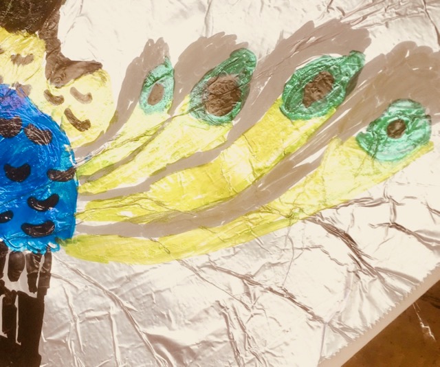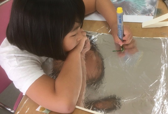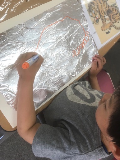 模写っていうのとちょっとちがう… …鑑賞というか観察というか……そっくりそのまま描きましょうなんて申しません。だってホイルに描いちゃうし、だってこともあろうに若冲さん。らぴすっこさんたちの第一声が「若冲さんかっこいい!!」