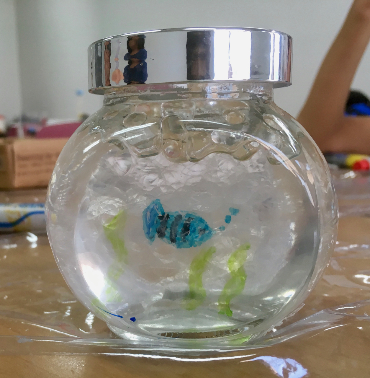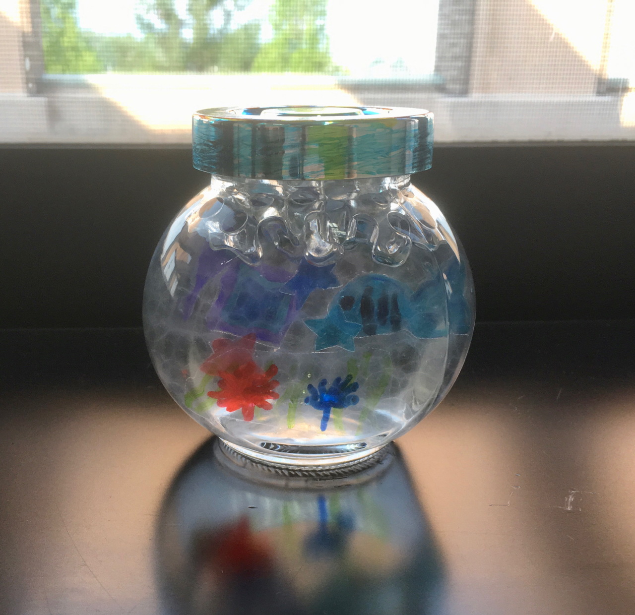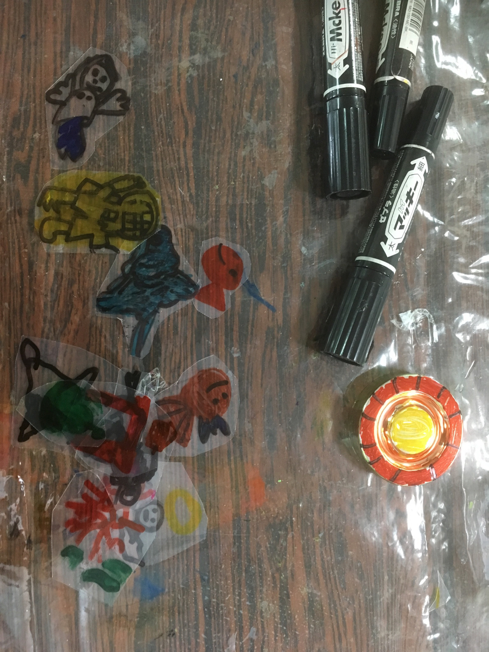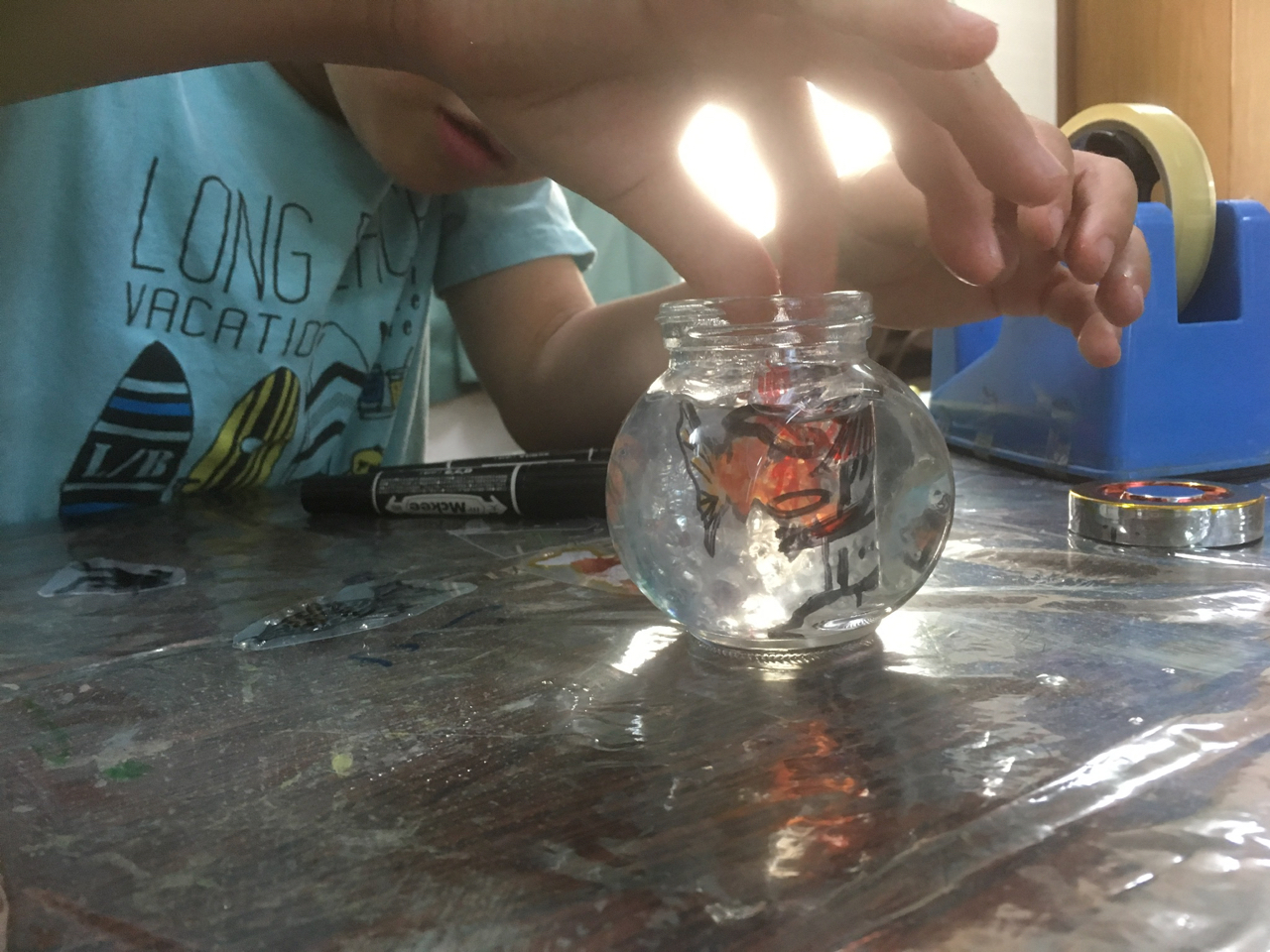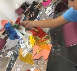 墨汁で遊んだ画用紙で渋めのコラージュ。海の仲間たち。
