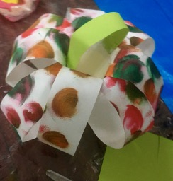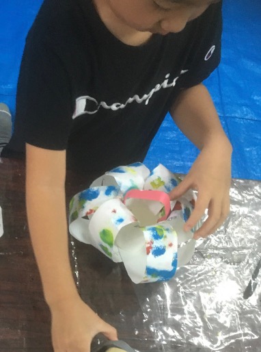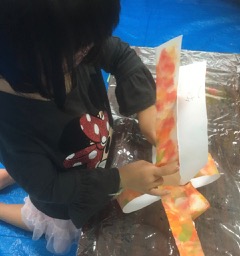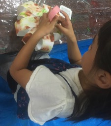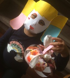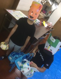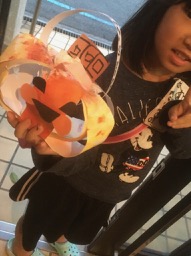 ちょっと不気味なお面と、かわいいカボチャを持って「Trick or treat」