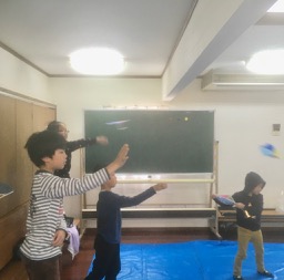 飛ばす工作もバランスが非常に大事。ちょっとしたことで飛んだり飛ばなかったり、あっち行ったり、こっち来たり、いろいろです。「飛べへぇ〜〜ん」とすぐ諦めるひともいたりしますが、研究熱心なひとは、ずぅ〜っと試行錯誤して延々と。そして身近な材料で作れるので、帰宅後もたくさん作っちゃうひともいるようです。