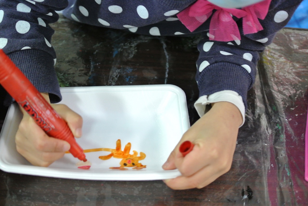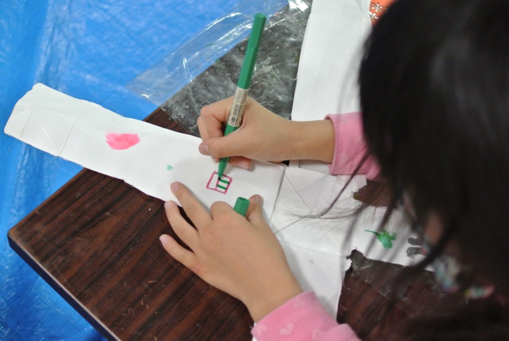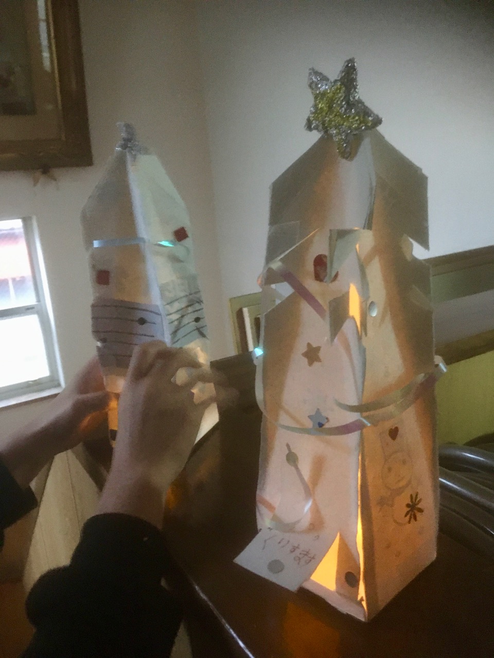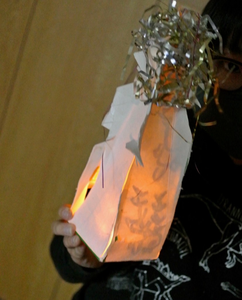 小さなライトを仕込むと中に描いた絵がほわ〜っと浮かび上がって、ワーワーキャーキャー大騒ぎ。