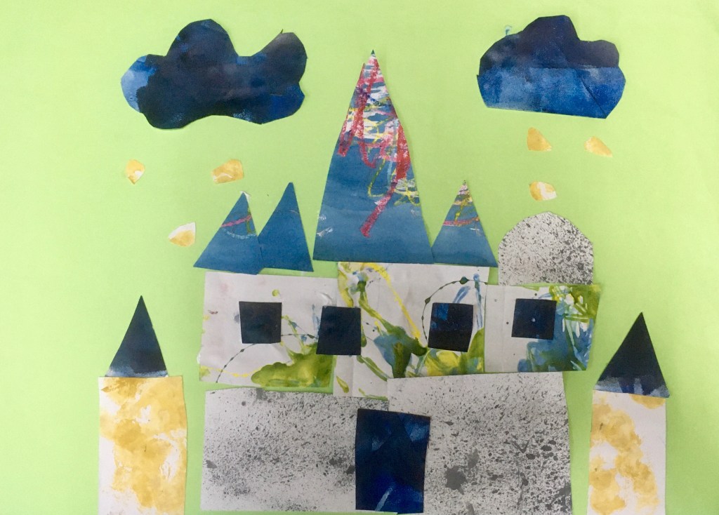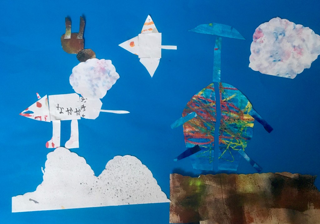 絵の具でいろいろ遊んだ画用紙を使ってコラージュです。
