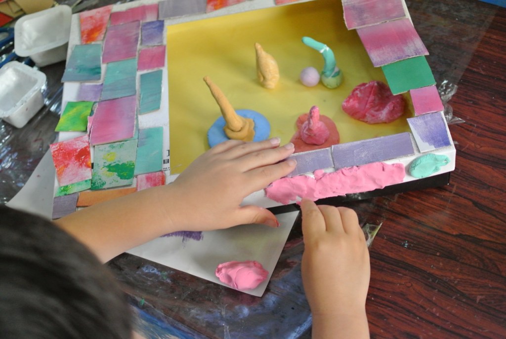 さて、レリーフの説明をちらっとして、紙粘土で凸凹の絵。空き箱で立体額もつくっています。「ビジターさんは用具不要」としているのですが、「空き箱、もってきましたぁ〜」って用意してきてくれて……感激🎶