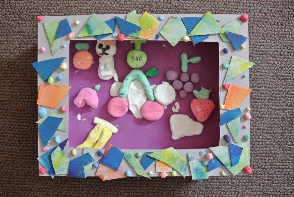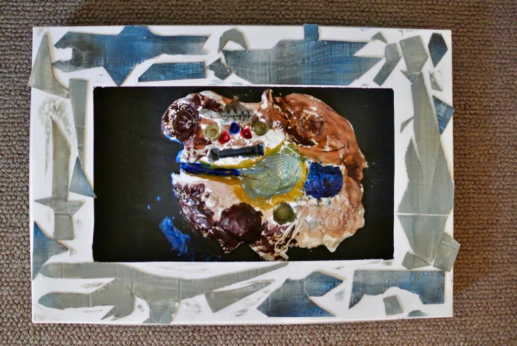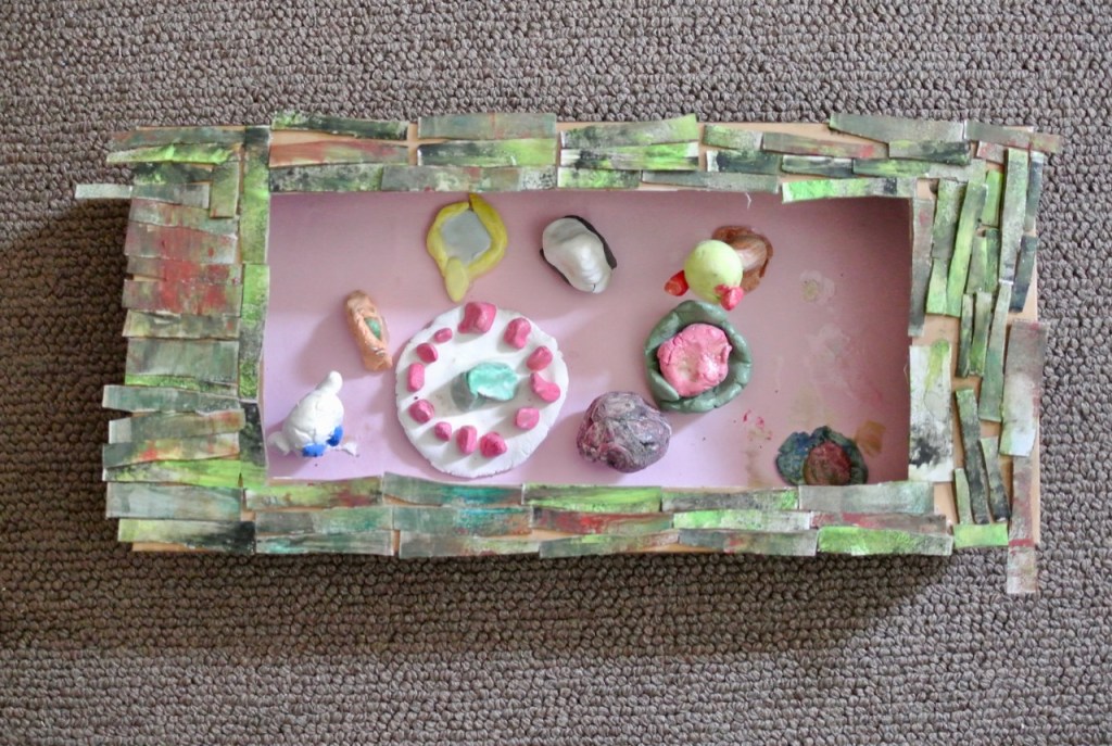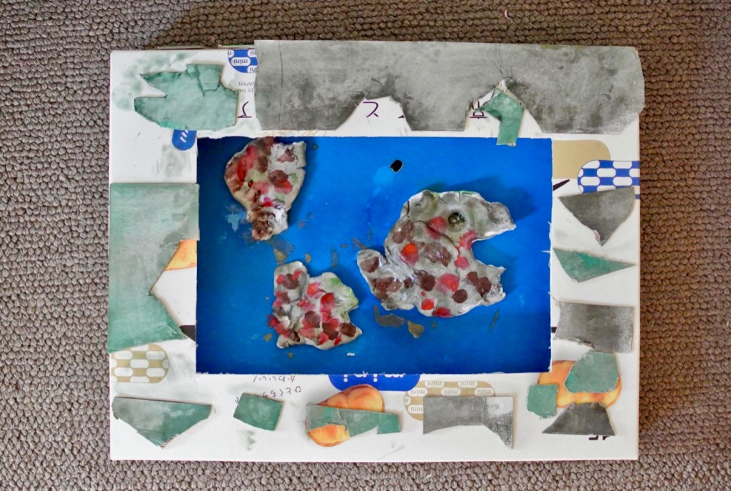 レリーフが出来上がって、残りの時間……急遽発泡トレイで飛び物作り。机の上に積んだ発泡トレイをみて、