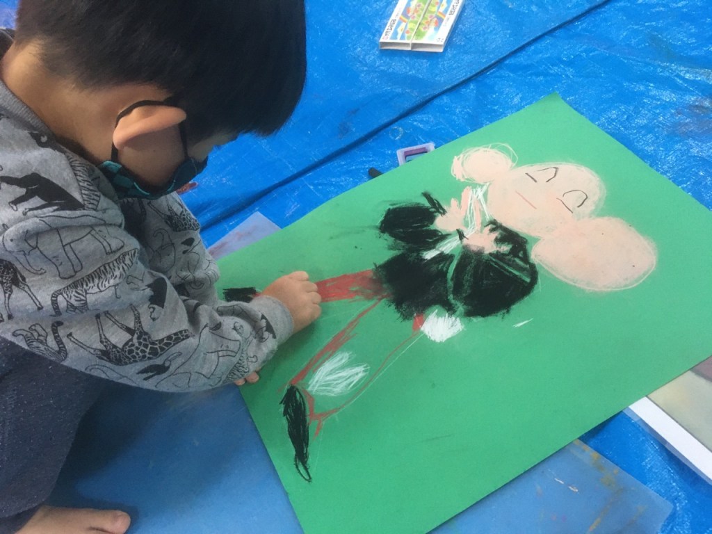 有名な絵画の模写。この後、5才の彼は帽子を描き、背景をたくさんの色を駆使して塗りまくりました。