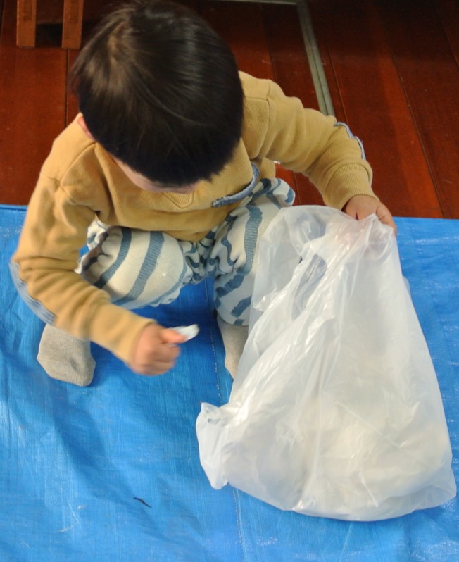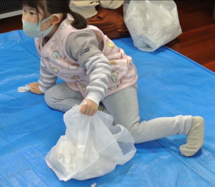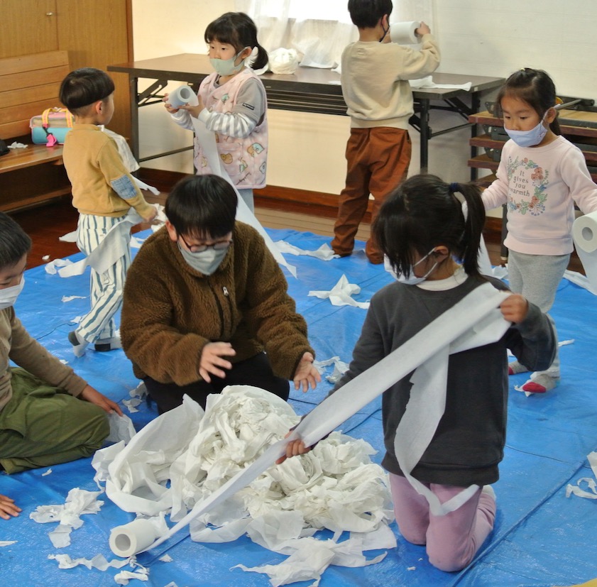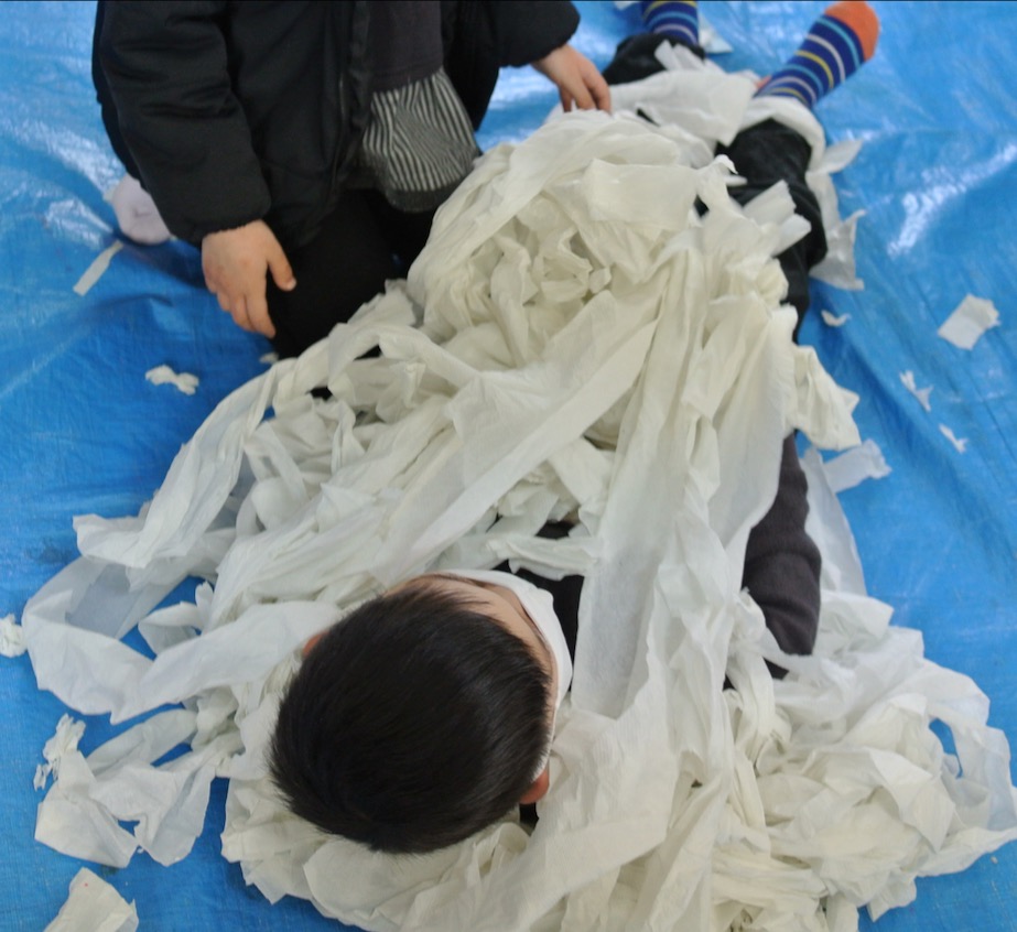 さて、トイレットペーパーで遊びました。結構エキサイティングなので、怪我しないようにただただ見張り番のわたし。みんな思い思いに遊んでくれました。さてさて、この後は・・・