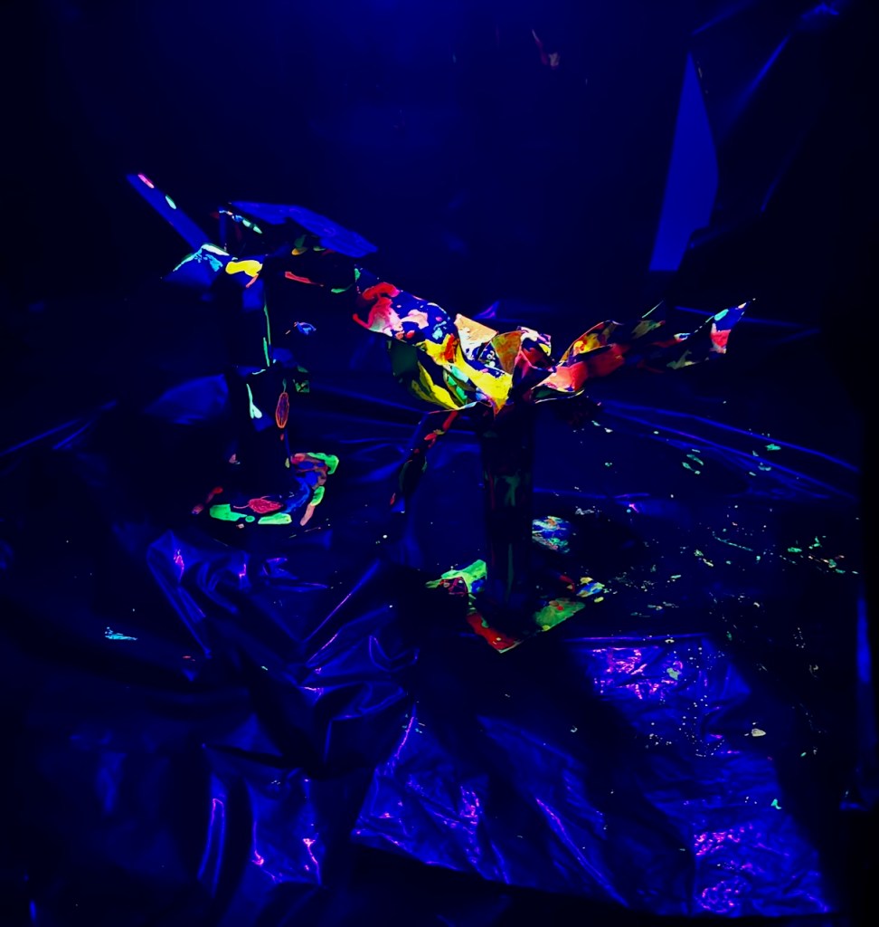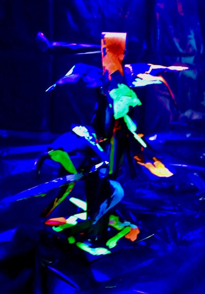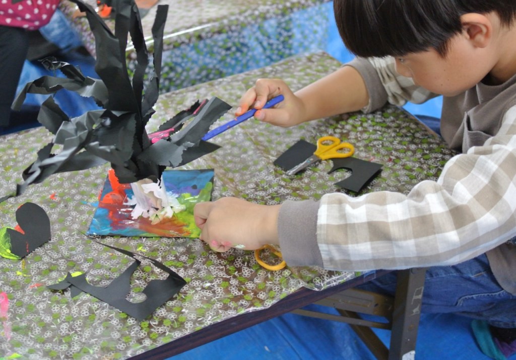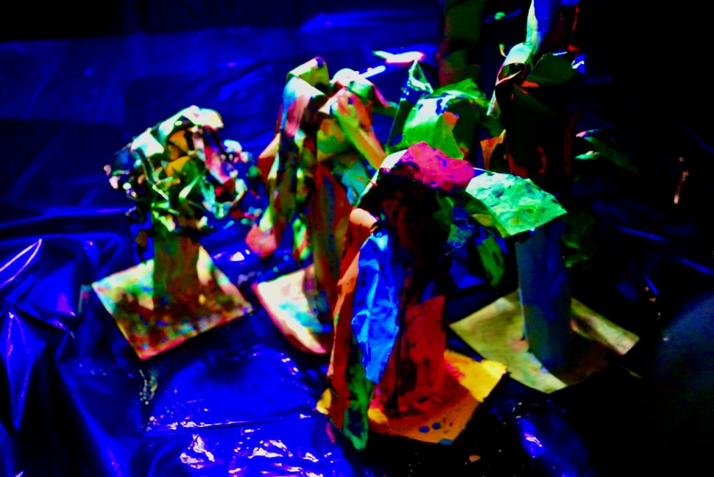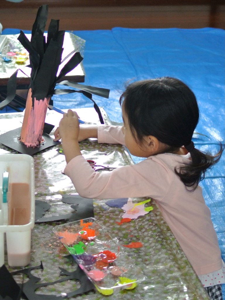 とあるところからひからびた(←失礼)蛍光ポスターカラーをいただきまして、先日せっかく暗室もつくったもんで、ブラックライトで異空間たいけ〜ん!ベテランらぴすっこさんもひからびた絵の具溶かしに協力してくれて、オバケが棲む不気味な(←失礼)木のできあがり〜