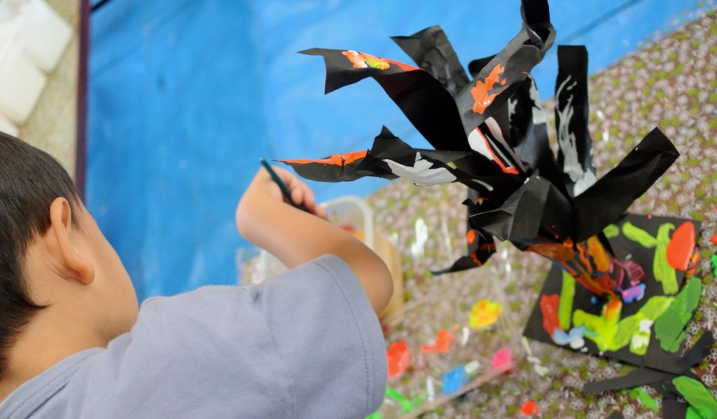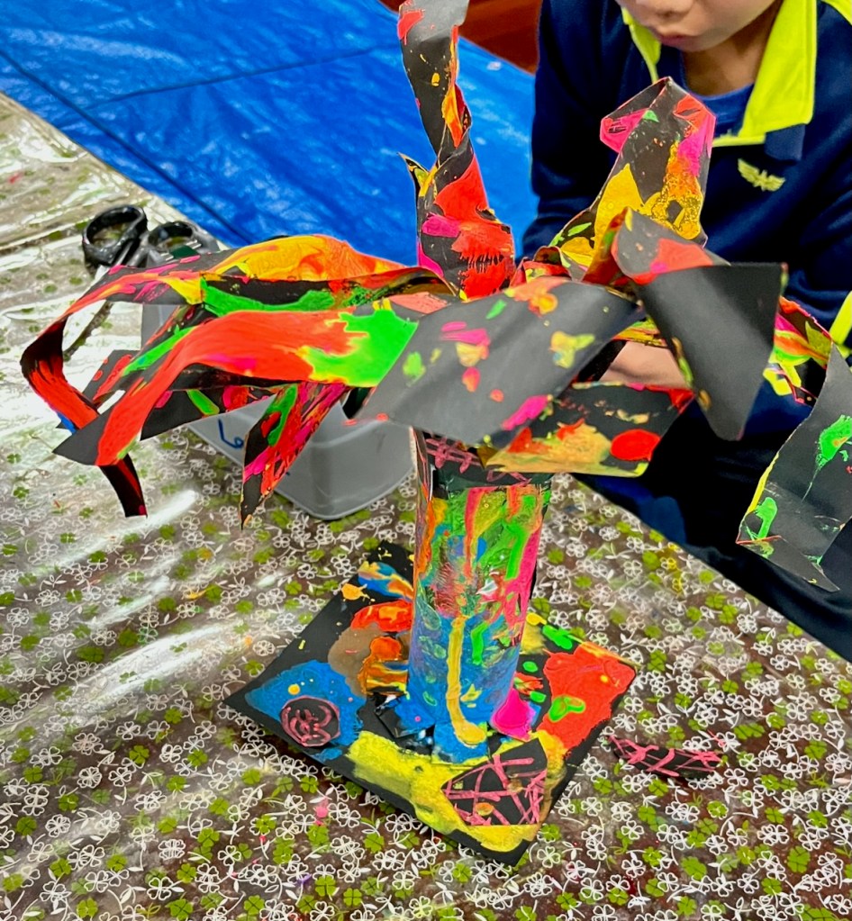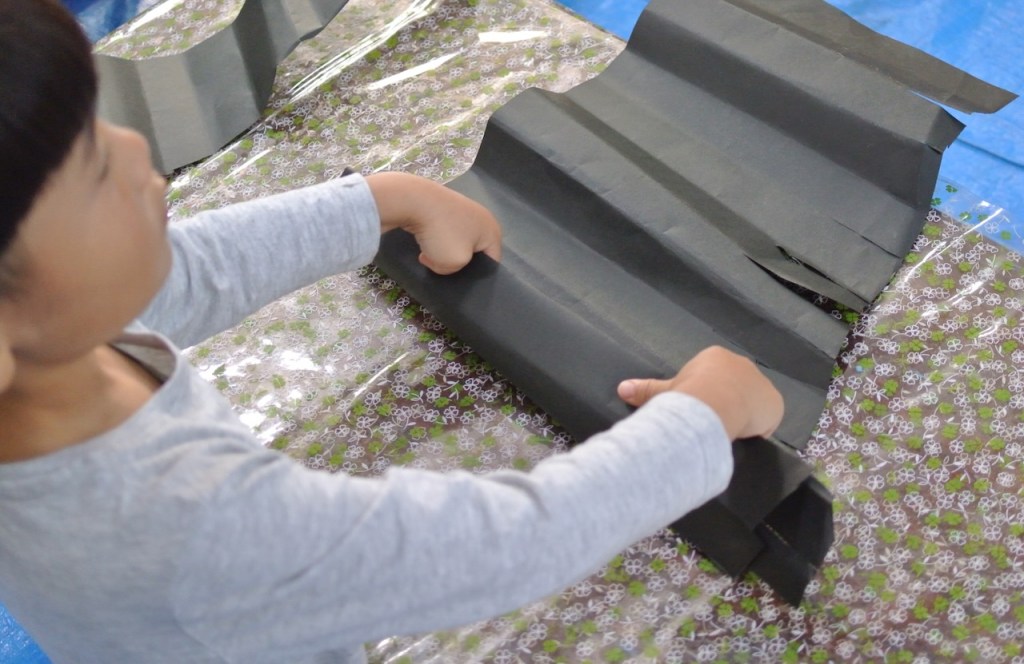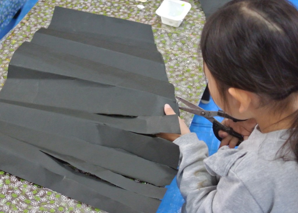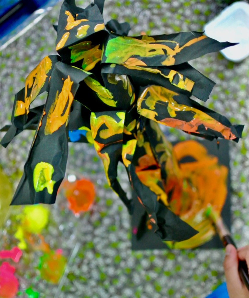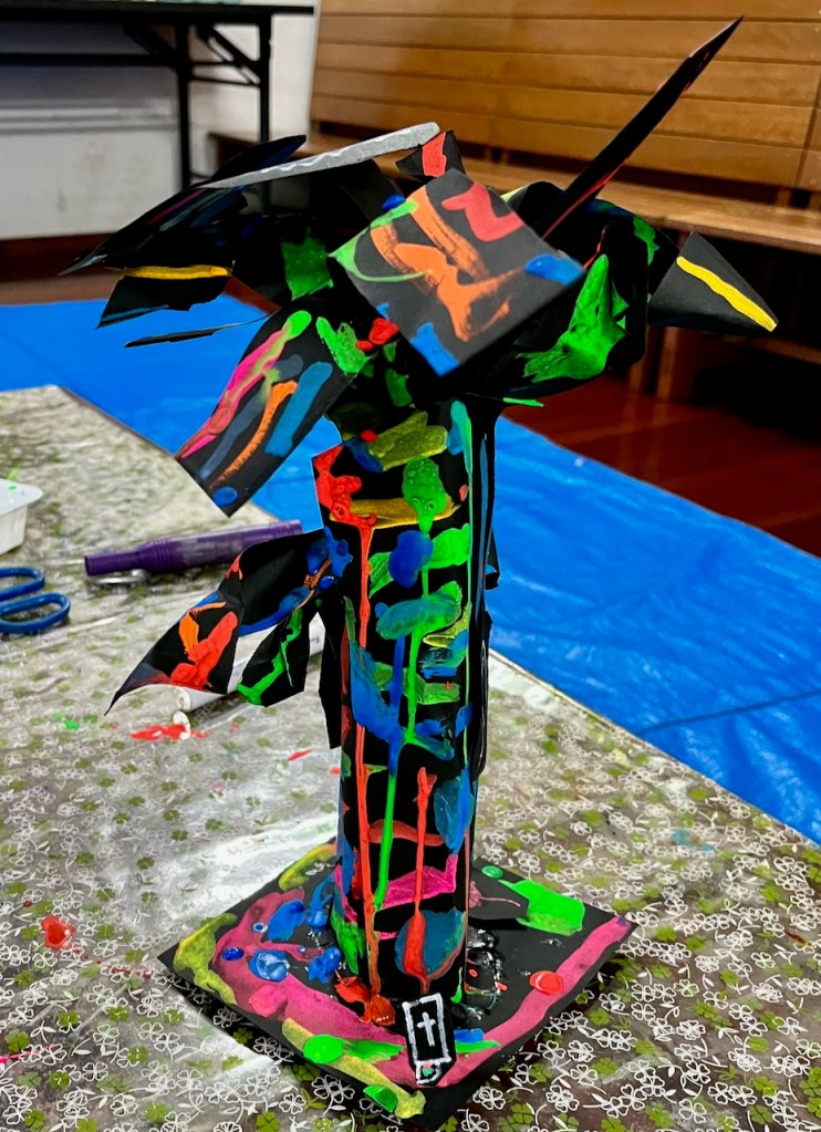 とあるところからひからびた(←失礼)蛍光ポスターカラーをいただきまして、先日せっかく暗室もつくったもんで、ブラックライトで異空間たいけ〜ん!ベテランらぴすっこさんもひからびた絵の具溶かしに協力してくれて、オバケが棲む不気味な(←失礼)木のできあがり〜