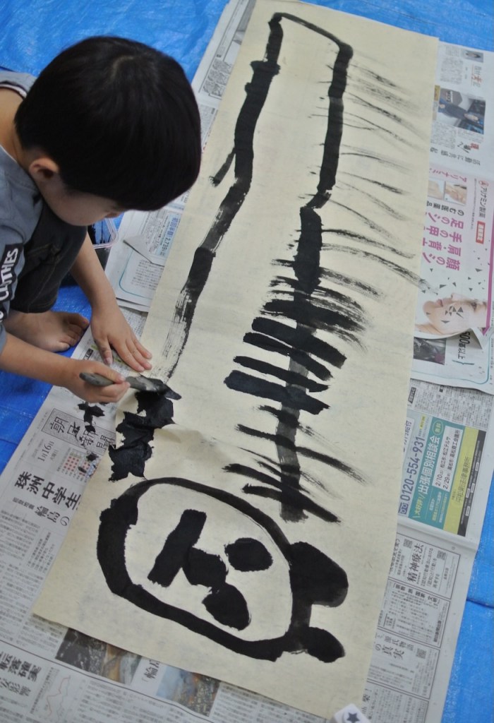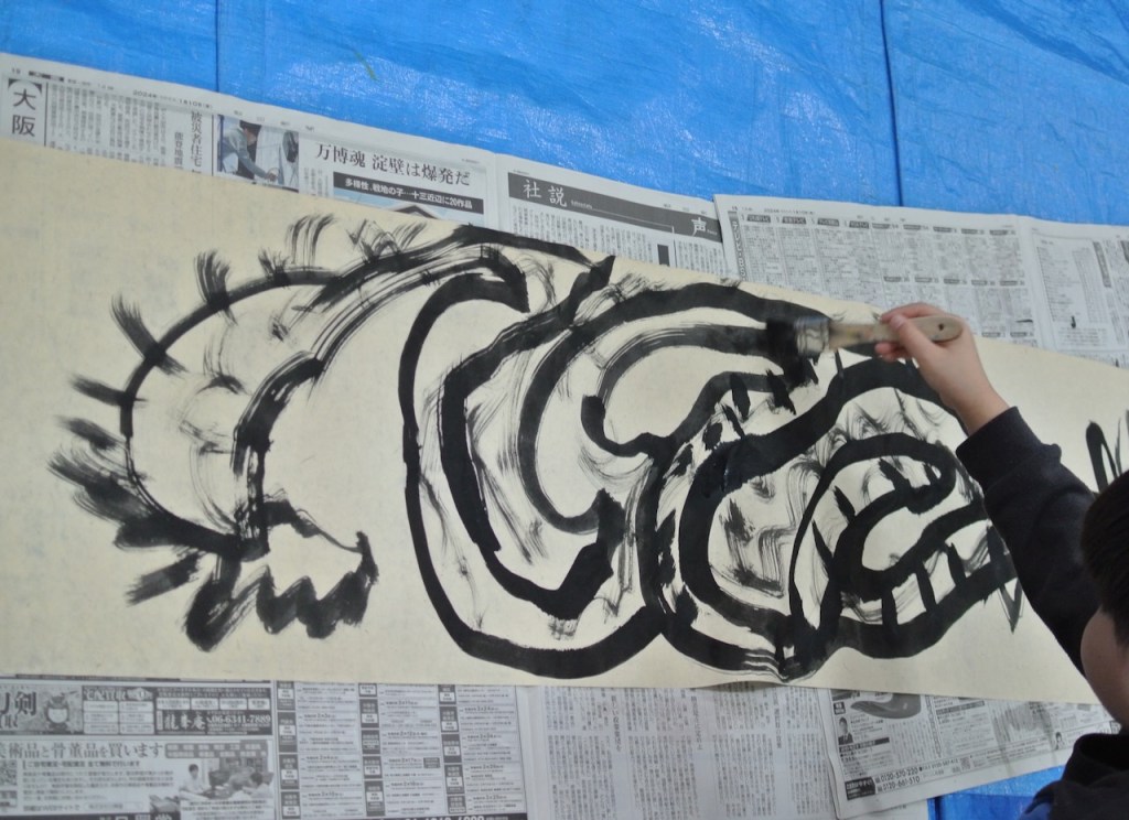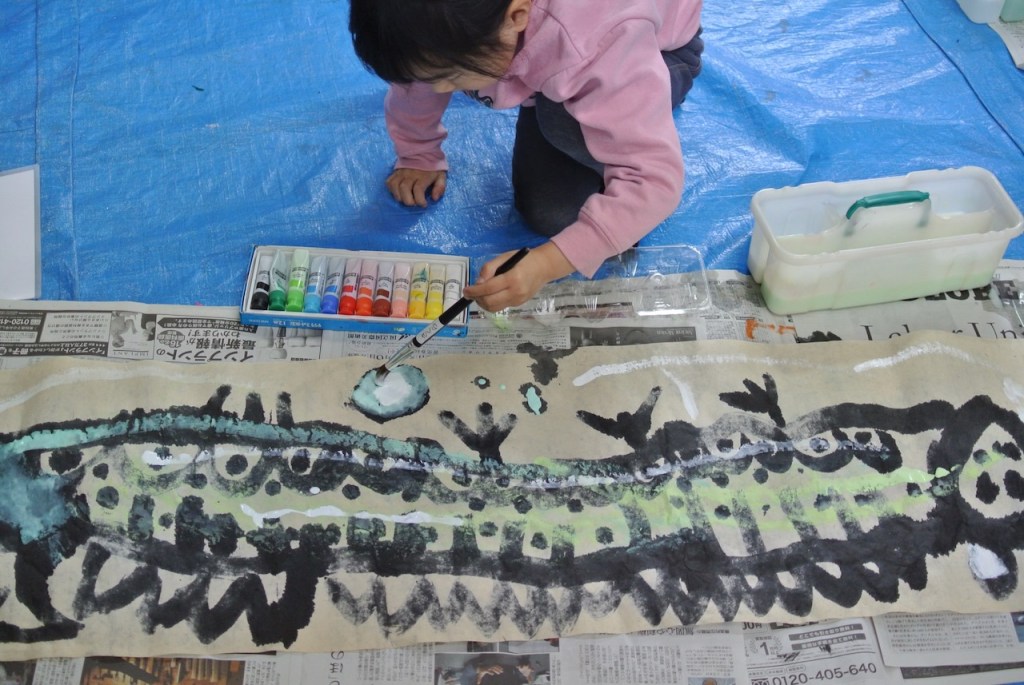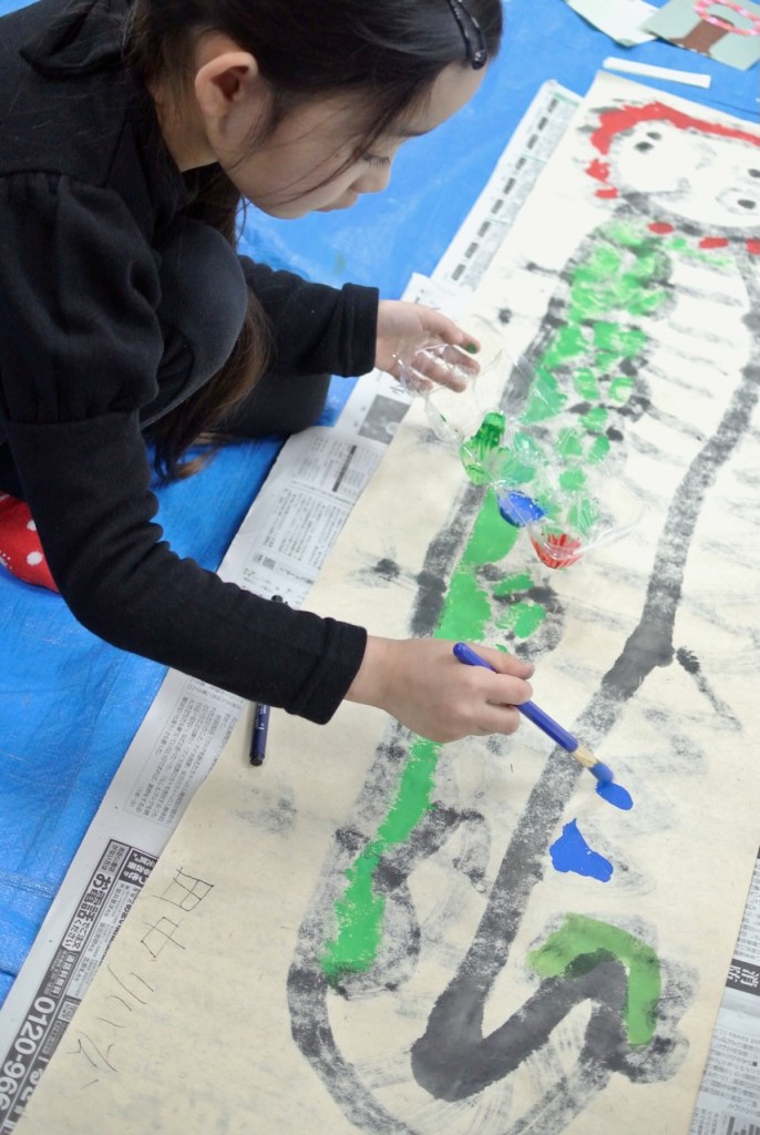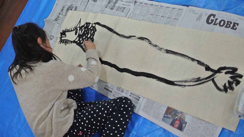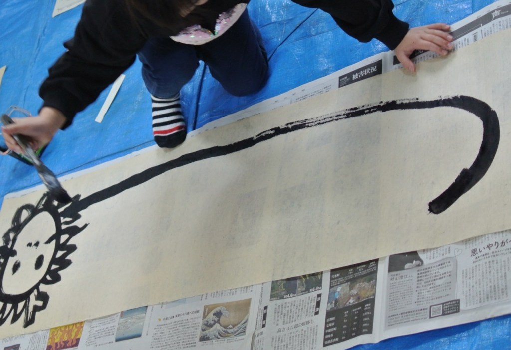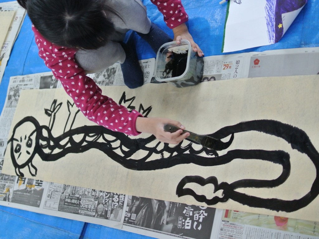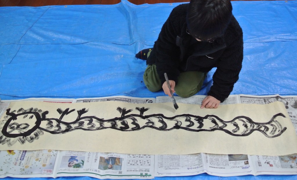 自分の身長よりも長い和紙に向かって今年の干支を描くらぴすっこさんたち。途中で疲れ果てるんじゃないかと思ってましたが、冬休み中に蓄えたパワーが残っていたのか、熱心に取り組んでくれました。