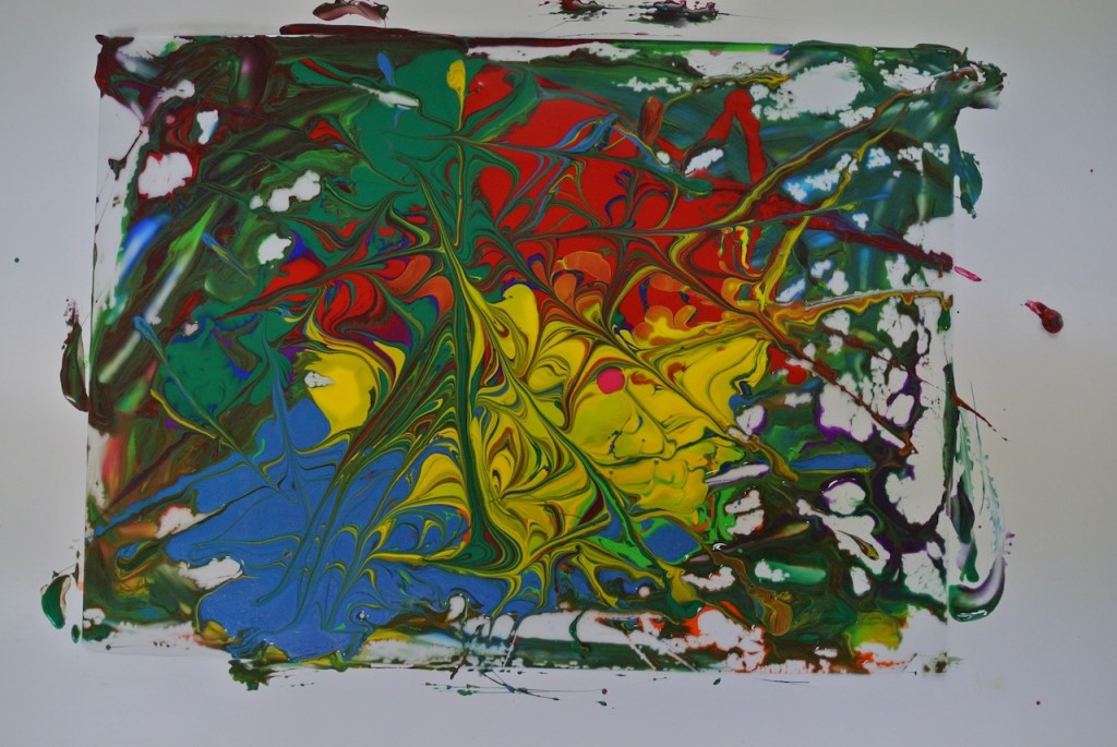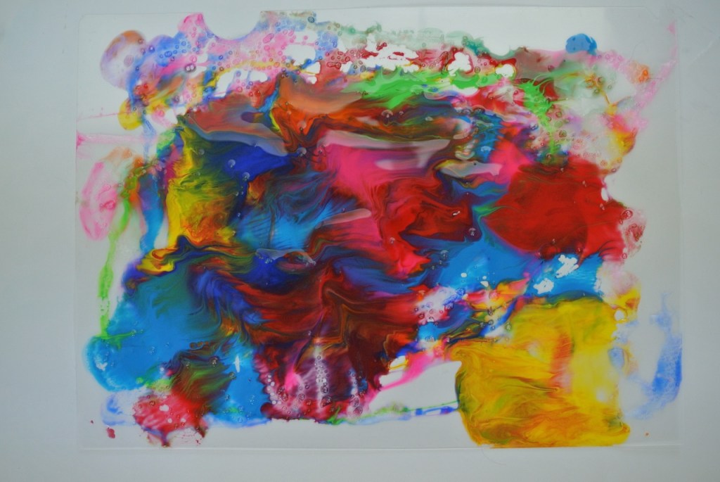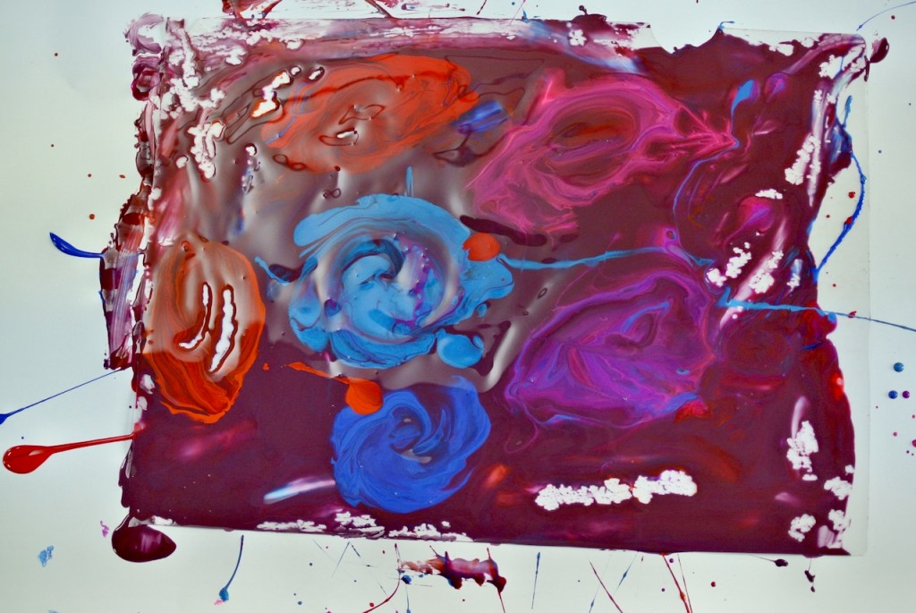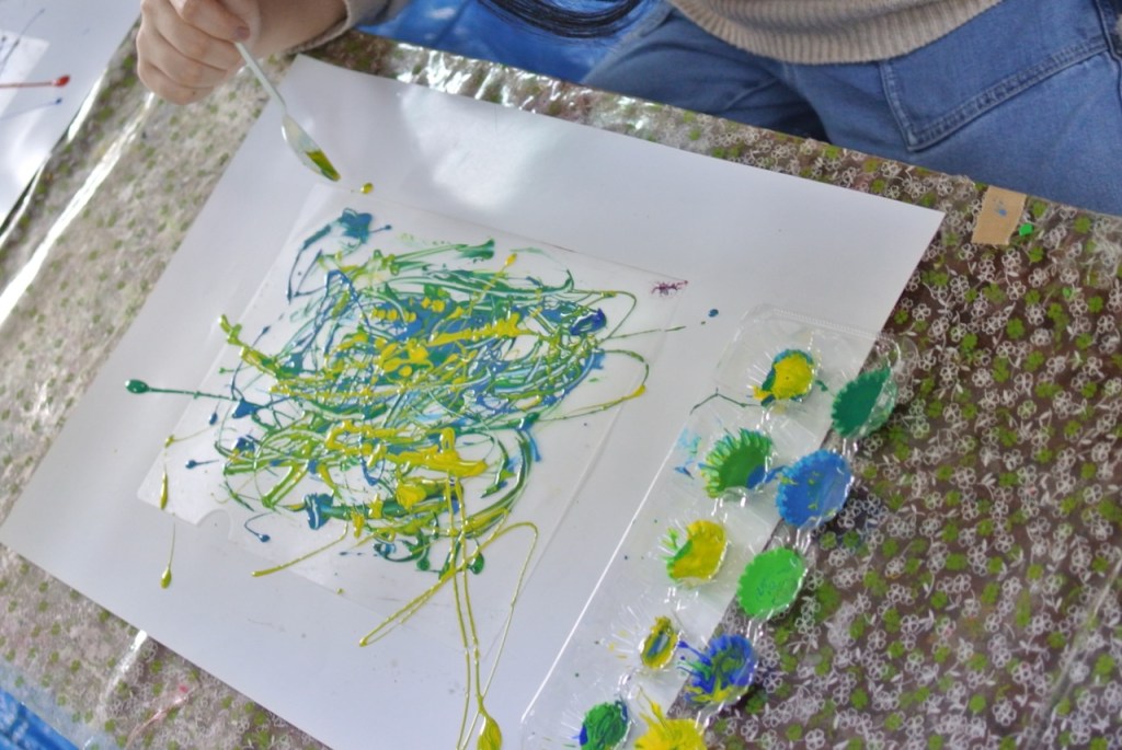 絵の具に混ぜ物をしてとろり〜んとさせまして・・・「汚れんの嫌やから絶対スプーン使う!!」と宣言してたらぴすっこさんも、だんだんとド派手な展開に・・・「せんせぇ〜ほら〜〜〜〜〜」と最終的には可愛いゾンビたち?がべちょべちょの手を見せながらウロウロウロウロ・・・