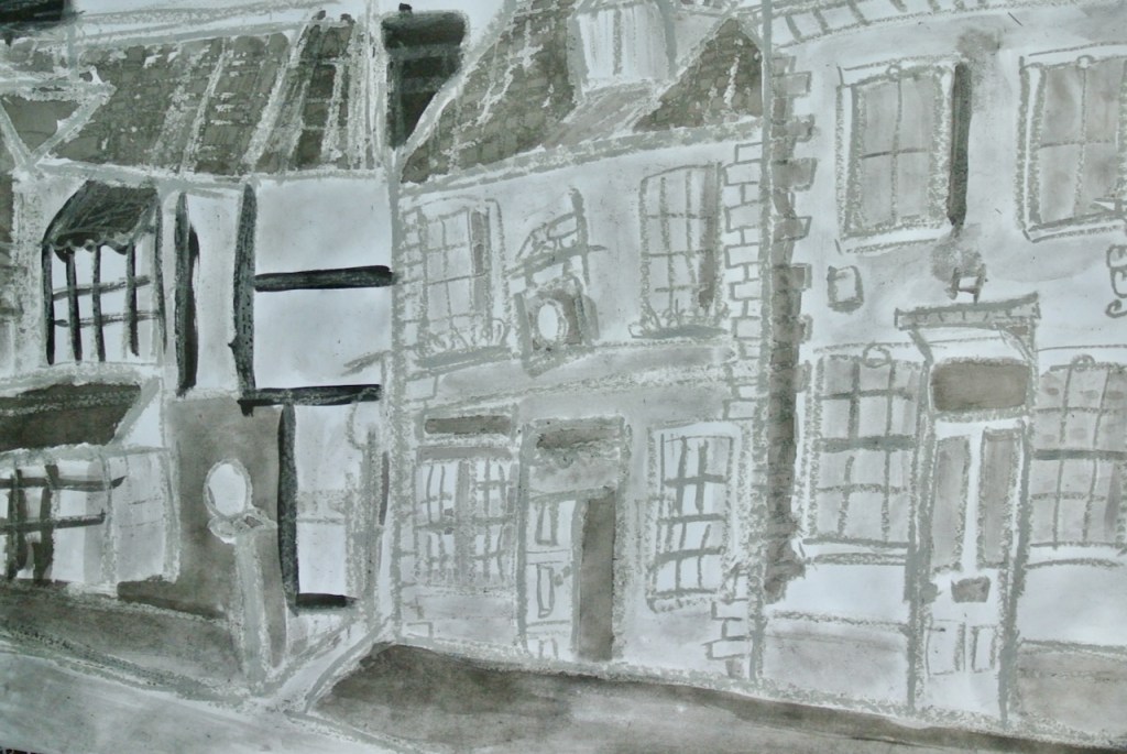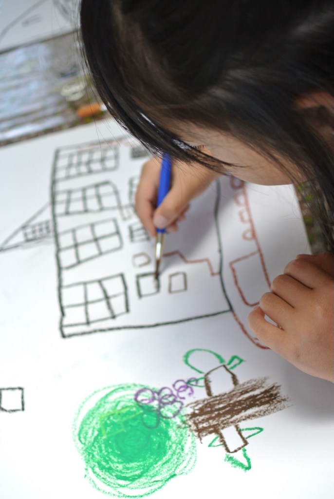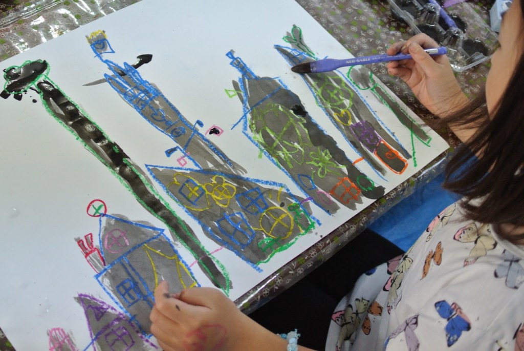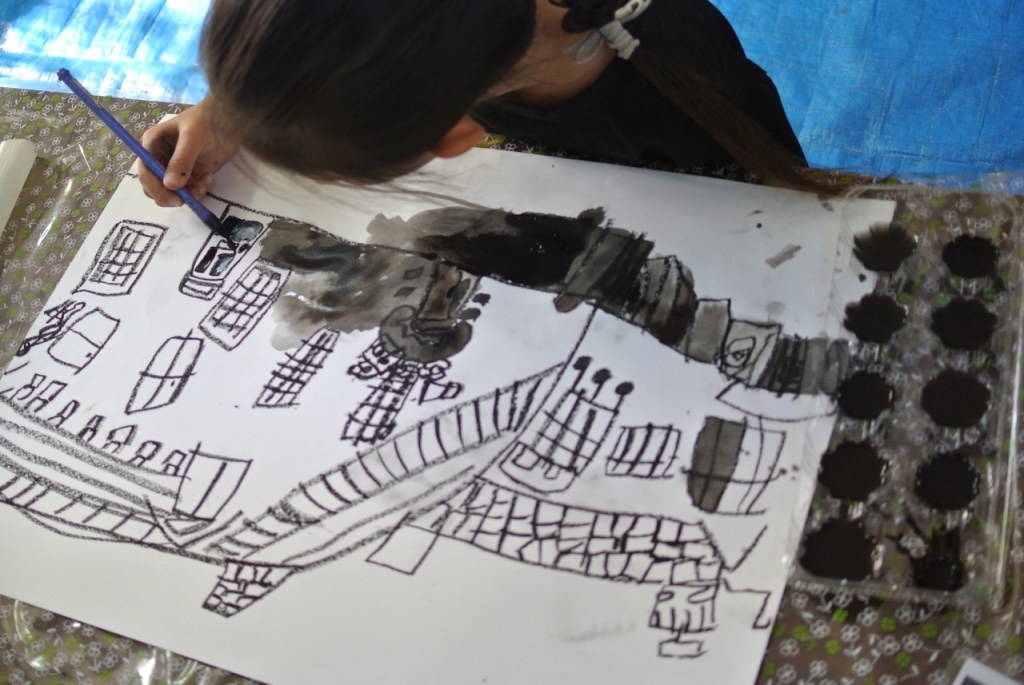 モノトーンで明暗を描き分ける・・・なんてちいさいらぴすっこさんには「???」ではありますが、「とりあえず『濃い感じ』のところ、『薄い感じ』のところ、『暗い感じ』のところ『明るい感じ』のところ、墨汁に水混ぜながら塗り分けてごらん」というざっくりした説明に「わかった!」と納得して、取り組んでくれました。出来上がりはまた後日♪♪♪