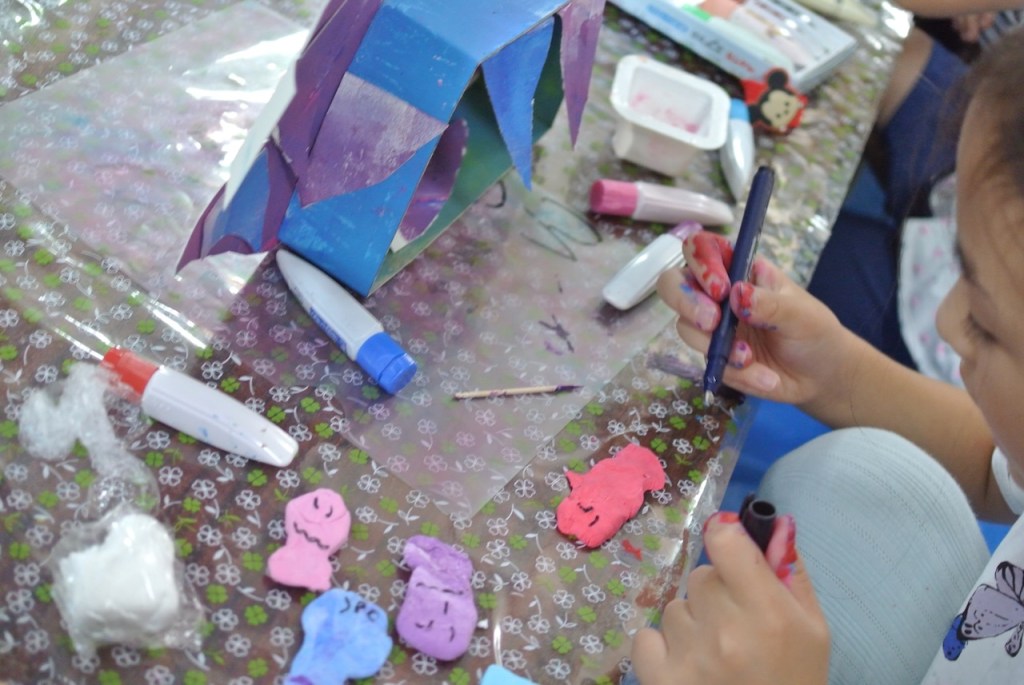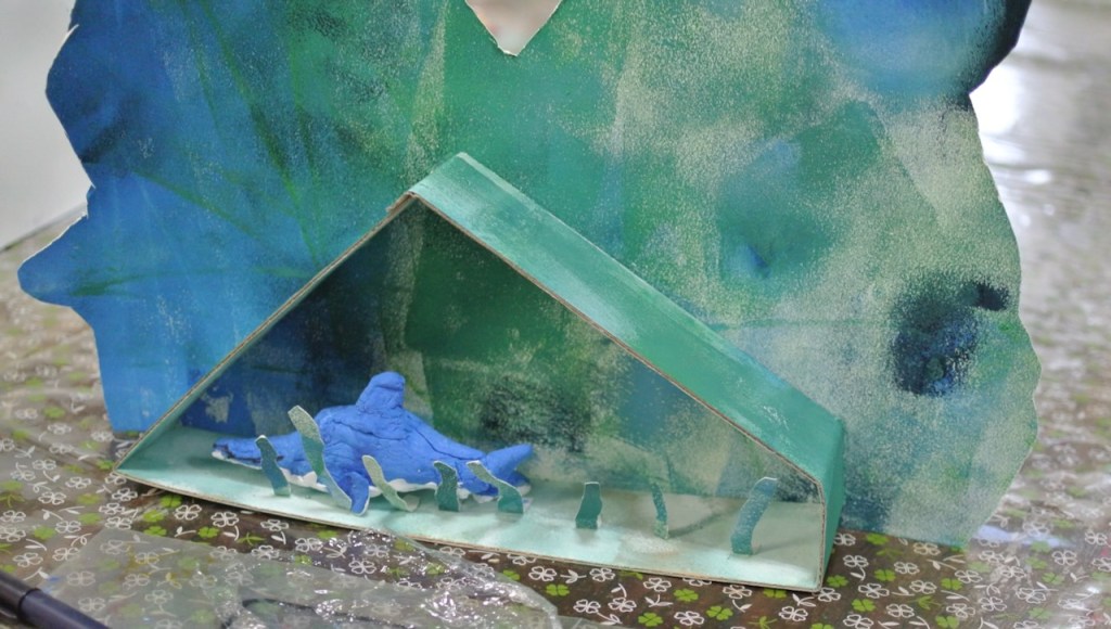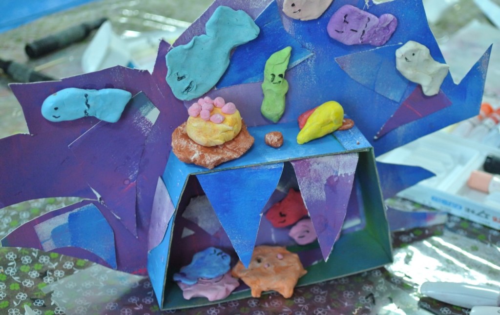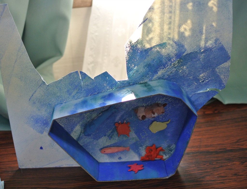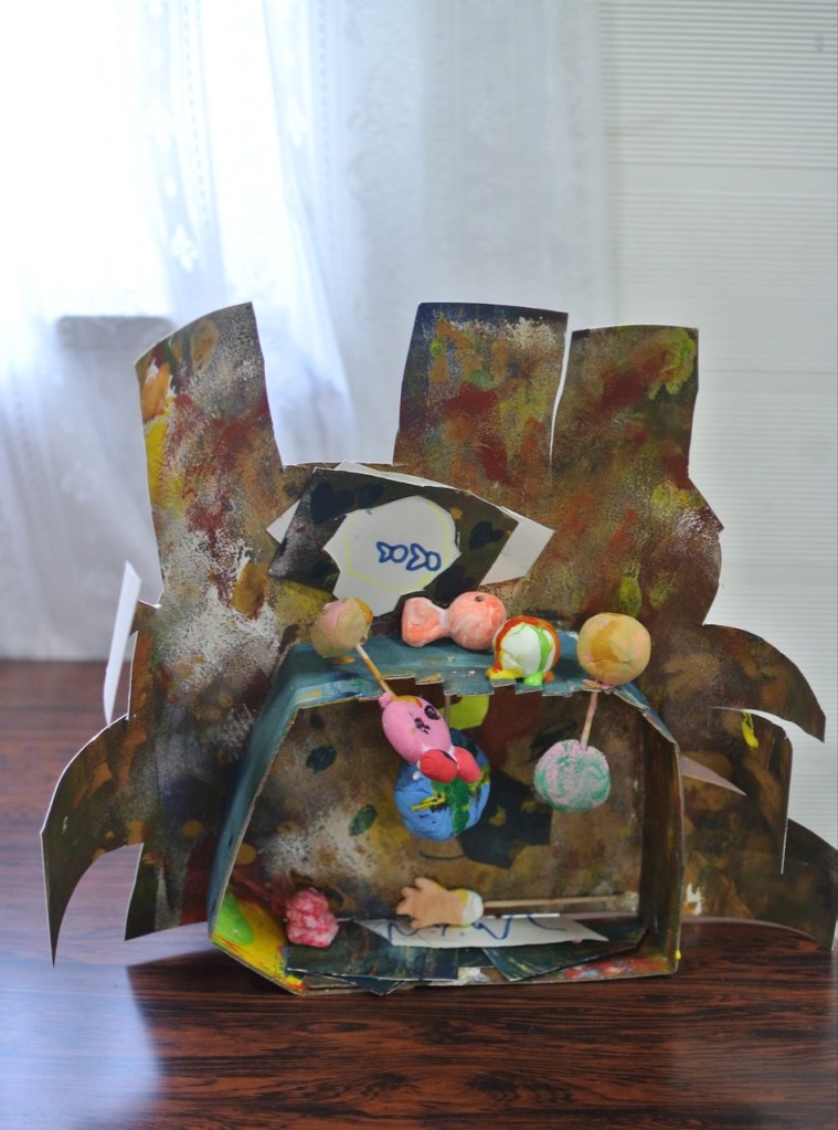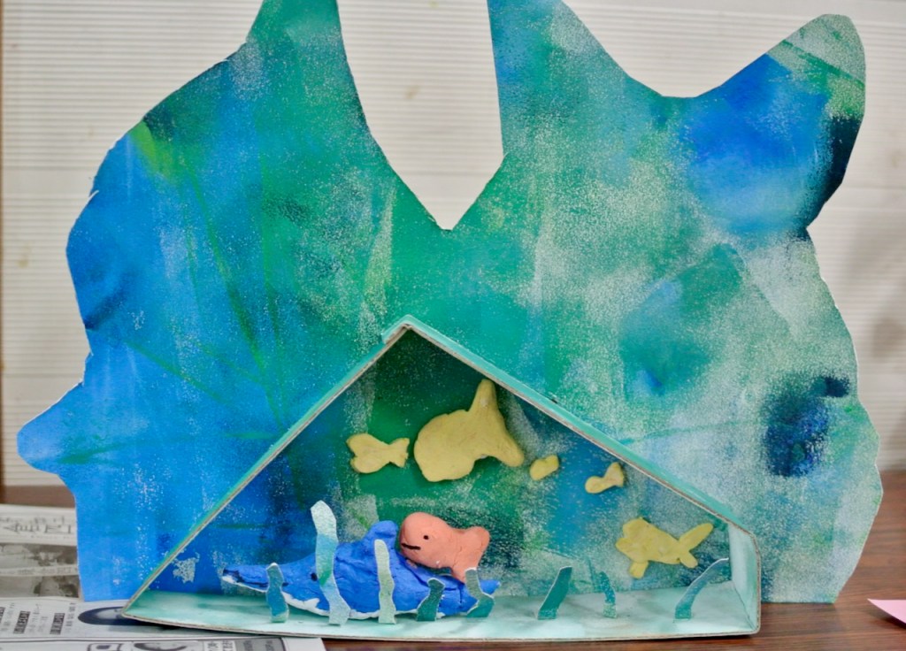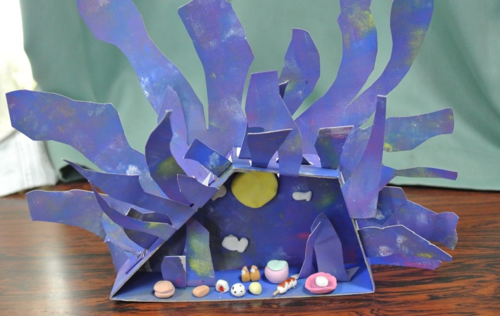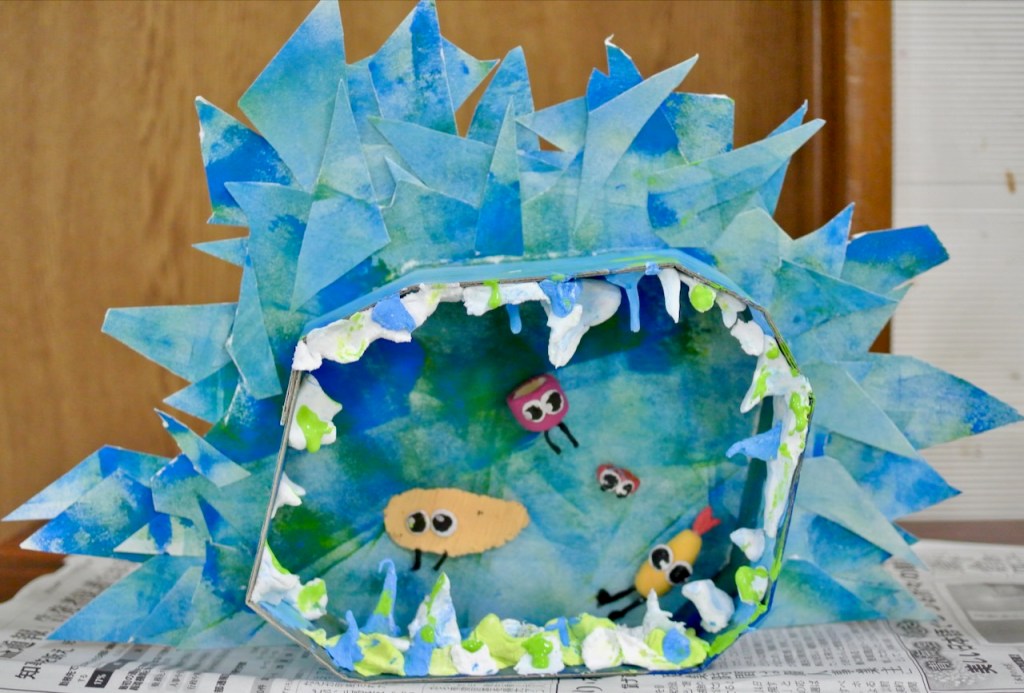 「珊瑚って言ったけど、ありえないものがいても全然かまわないよ。だって想像の世界なんだから。」すると・・・出るわ出るわ・・・恐竜やらみたらし団子やらキャラクターやら・・・楽しい世界ができました。