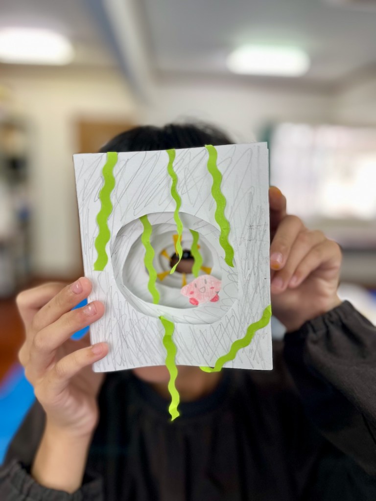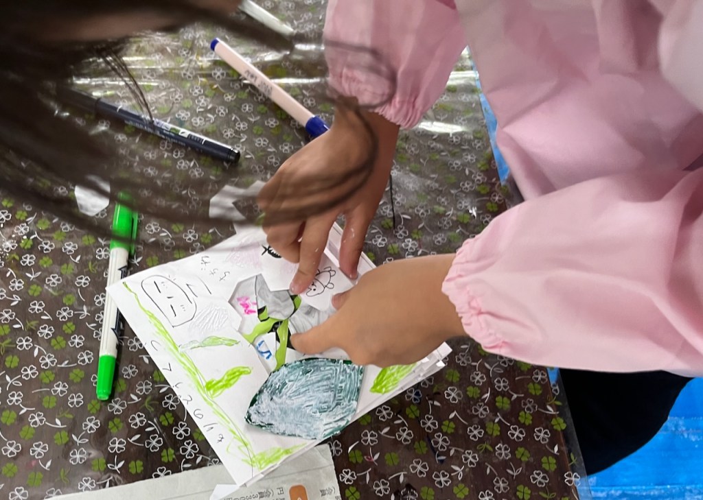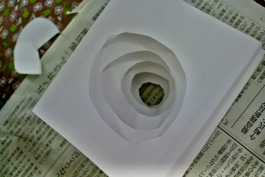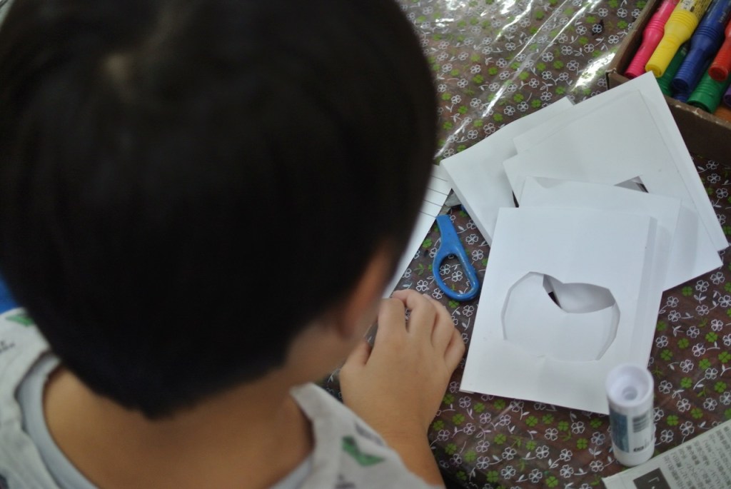 画用紙に穴を掘り続け・・・2時間弱・・・力尽きたひともいれば・・・いつまでもいつまでも掘り続けるひとも(「来週も続きする!!」と元気な声)・・・人生いろいろ・・・