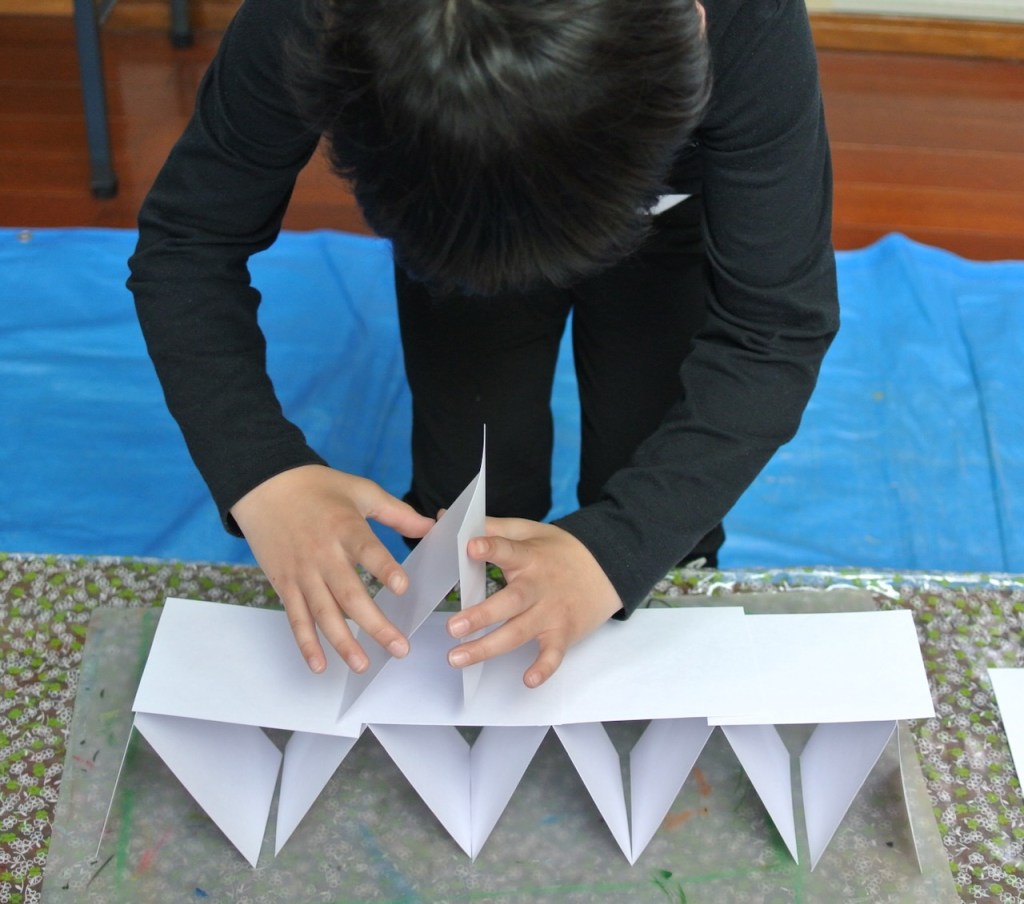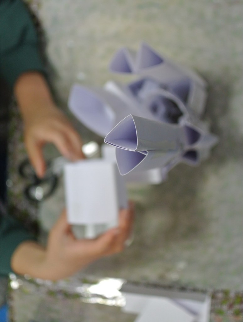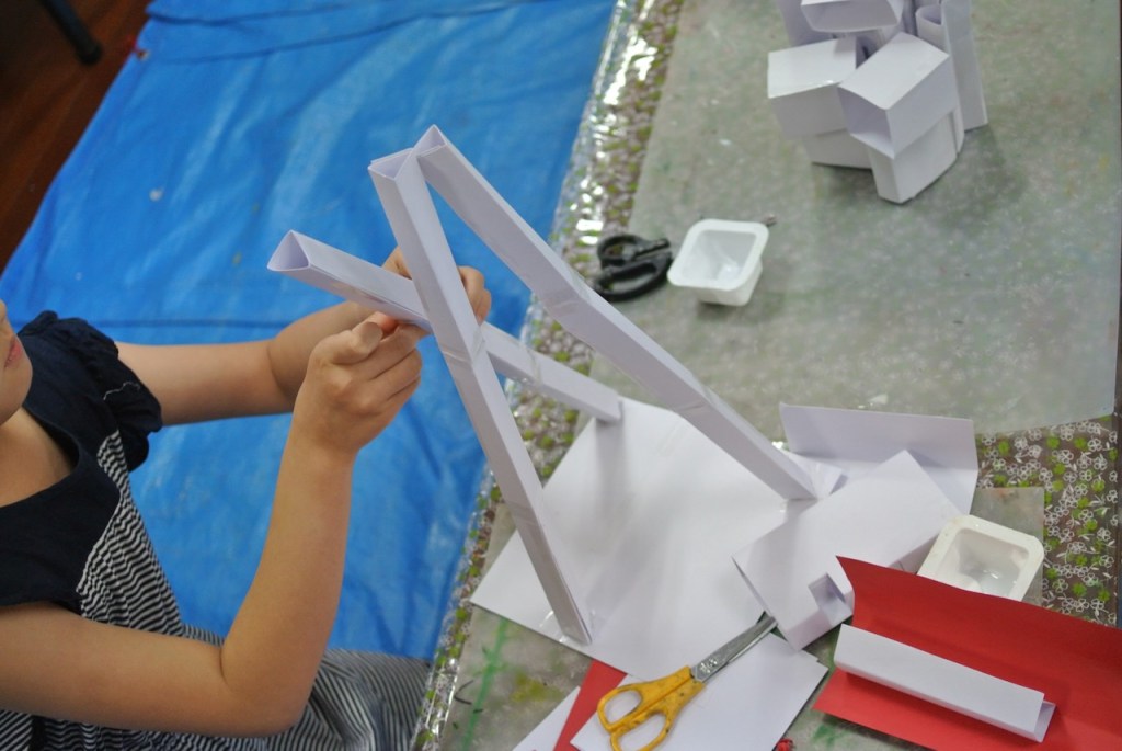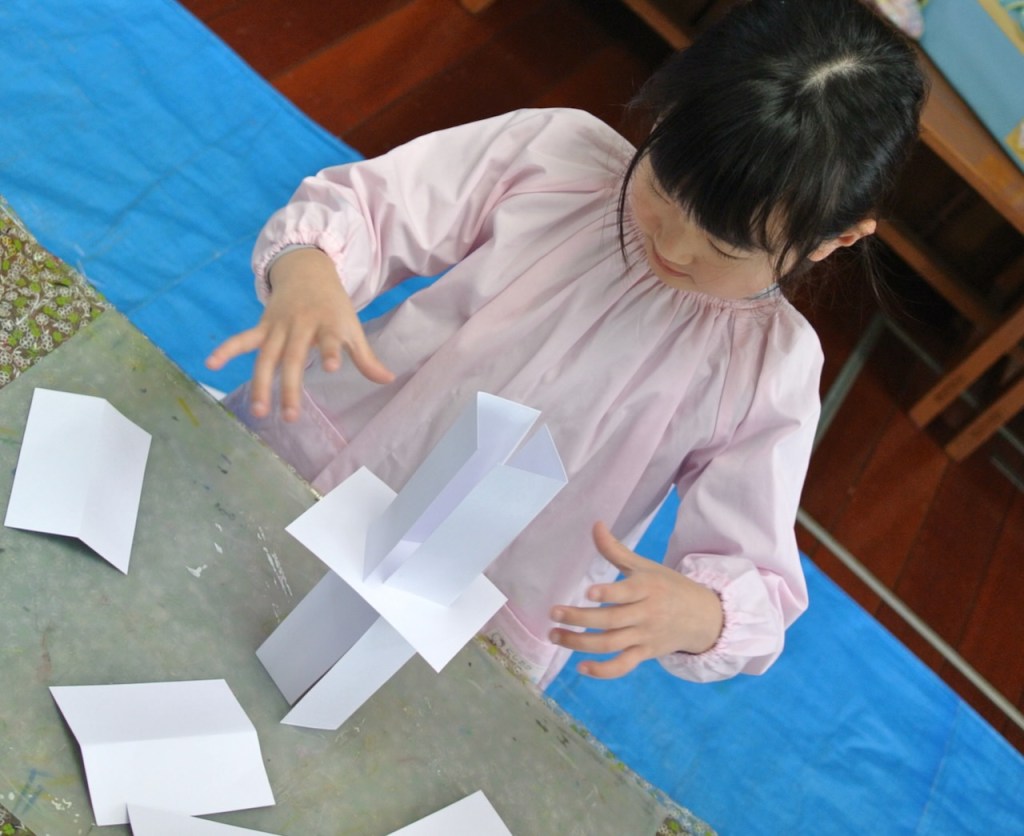 ハガキ大程度の画用紙を用意しました。①この紙だけでできるだけ高くて立っているものを作ってみましょう②次はハサミも使ってみましょう③次はボンドも使おう④今度はテープも使っていいよ